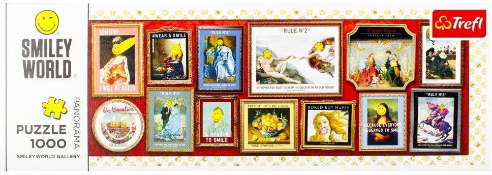 Trefl Puzzle 1000el. Galeria Smiley 29053 Puzzle składające się z 1000 elementów przedstawiające galerię Smiley. Puzzle "1000" Trefl są wykonane z wysokiej jakości materiałów. Do produkcji układanek stosujemy specjalny kalandrowany papier, odpowiednio odbijający światło, co gwarantuje wysoki komfort układania puzzli.  Układanie puzzli niesie za sobą szereg korzyści, zarówni dla dzieci jak i dorosłych. To skuteczny sposób na ćwiczenie pamięci, koncentracji, a także niezawodny sposób na odstrsowanie się i odprężenie. Dzięki puzzlom trenujemy spostrzegawczość, ale również uczymy się cierpliwości. Ułożony przez nas, gotowy obraz możemy powiesić na ścianie, a tym samym urozmaicić wnętrze naszego mieszkania.
