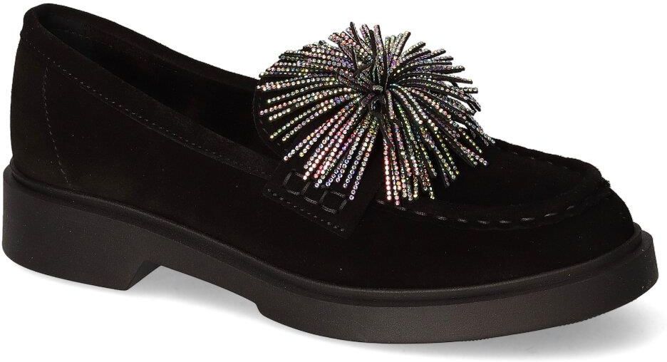 Wyjątkowe mokasyny znanej marki CheBello:- cholewka wykonana została ze skóry naturalnej zamszowej - wnętrze pokryte zostało materiałem tekstylnym aby zapewnić komfort podczas użytkowania - wkładka wewnętrzna została wykonana ze skóry naturalnej - podeszwa o grubości 3,5 cm zapewnia odpowiednią stabilizację - czarny kolor, nowoczesna ozdoba i modny fason tworzą niepowtarzalny efekt!