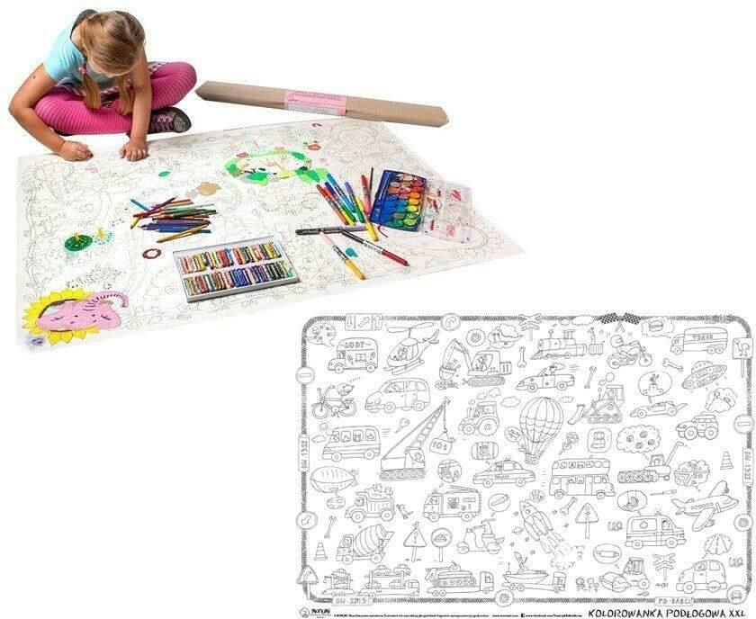 Zabawka roku 2013Kolorowanki Podłogowe w rozmiarze XXL o wymiarach 120cm x 80cm - ogromna powierzchnia do kolorowania kredkami, flamastrami i farbami. Wzmocniony spód arkusza zabezpiecza przed przesiąkaniem farb.Kolorowanka wykonana jest z grubego kartonu (podobnego do brystolu), który można bez końca rozkładać i zwijać!Zabawa kolorowanką rozwijają sprawność manualną - pomaga przygotować małą dłoń do poprawnego posługiwania się długopisem i ołówkiem w szkole.Przygoto...