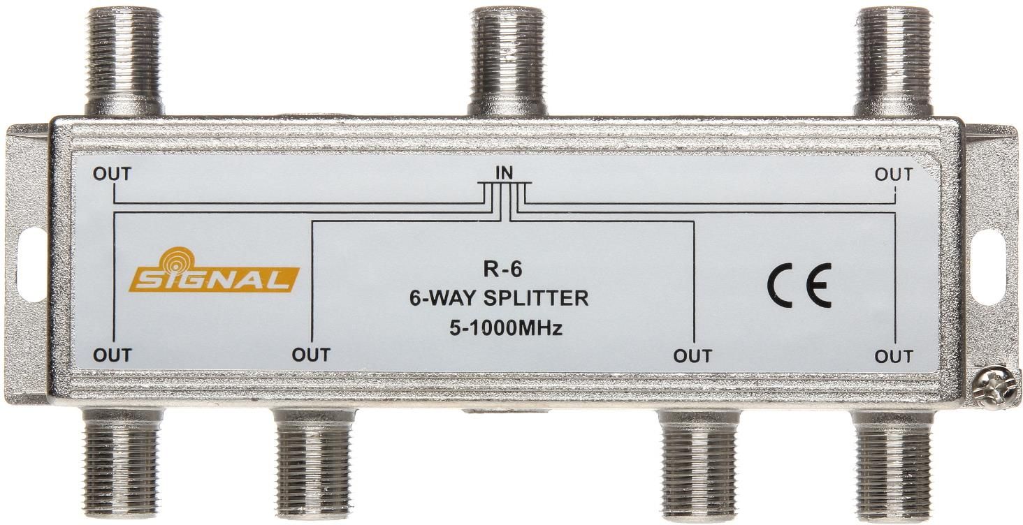 Rozgałęźnik TV sześciodrożny R-6 Signal Do 6 telewizorów Wysokiej klasy rozgałęźnik sygnału DVB-T i FM. Rozgałęźnik nie przepuszcza napięcia do anteny w związku z czym znajduje swoje zastosowanie w przypadku rozdzielenia sygnału z anteny pasywnej lub rozdzielenia sygnału ze wzmacniacza budynkowego z własnym zasilaczem (na przykład Terra HS-013). W przypadku zastosowania rozgałęźnika do anteny aktywnej należy pamiętać o tym, że zasilacz antenowy musi się znajdować między rozdzielaczem a anteną a nie jak to jest w przypadku rozgałęźników przepuszczających napięcie przy jednym z telewizorów. Rozgałęźnik do zastosowań wewnątrz budynku. Rozgałęźnik posiada polską homologację. Jest wykonany z odlewanej obudowy ze stopów aluminium. Dane techniczne Ilość wyjść: 6 Tłumienie [dB]: 9 Pasmo [Mhz]: 5-1000