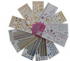 Tatuaże metaliczne złoto/srebrne – 12 wzorów pakowane jako mix (12 szt. w opakowaniu zbiorczym). Cena dotyczy jednej sztuki. Różne wzory, wybierane losowo. Informacje o produkcie Nr katalogowy STN-14-14 Marka (Zabawki) Brak Rodzaj (Moda i Uroda::Ozdoby) Tatuaże Wymagania wiekowe od 5 lat Płeć (zabawki) Dziewczynki i chłopcy Kolor (wyliczeniowy) Mix Pozostałe parametry Wymiary opakowania: 24 x 11 x 0,2 cm