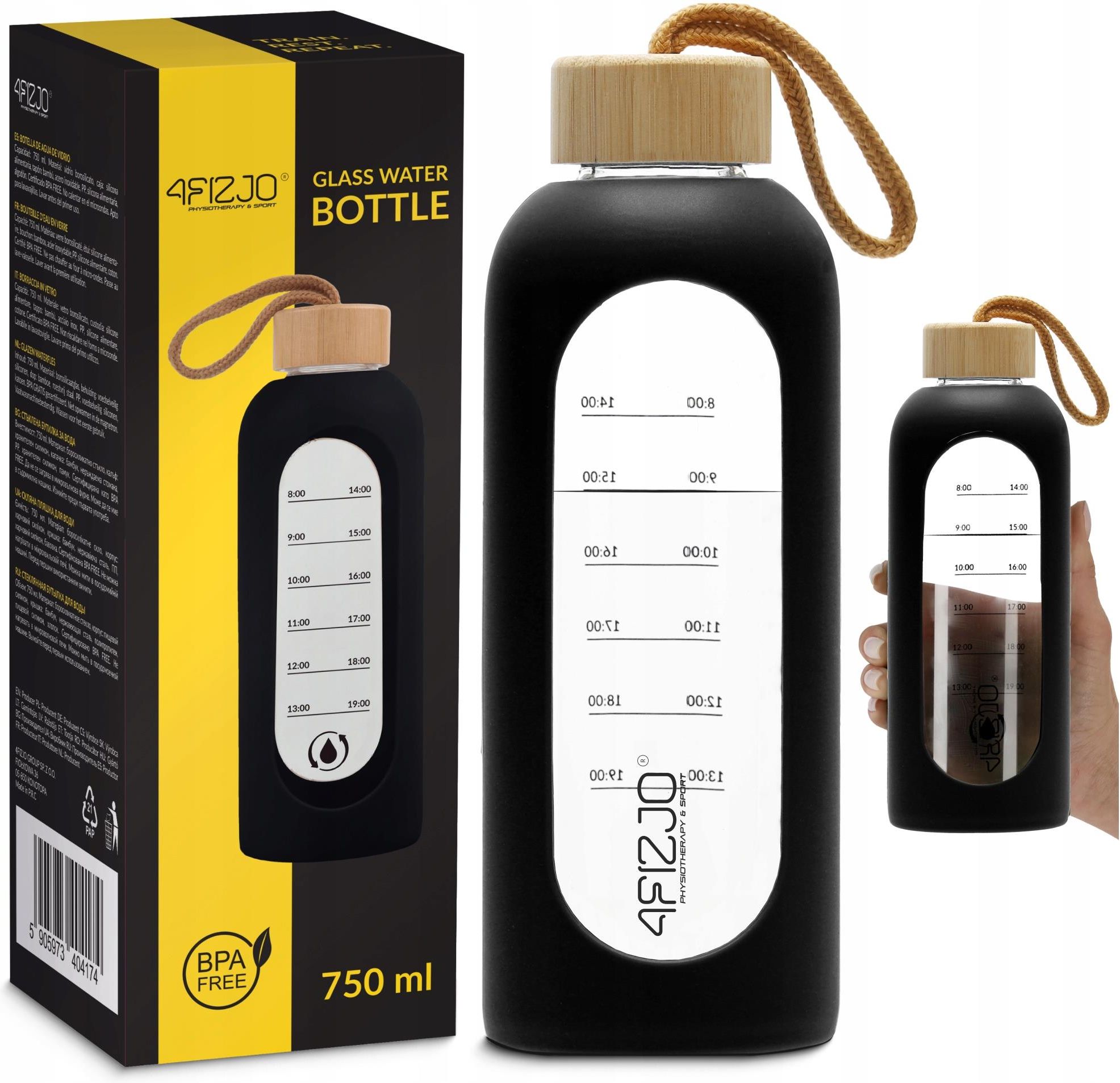 4FIZJO Butelka Szklana Na Wodę Bidon Motywacyjna Szczelna Silikonowe Etui 750Ml Czarny Biłgoraj