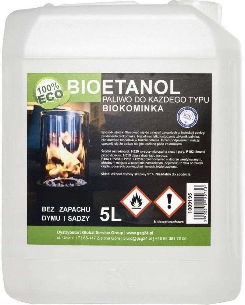 Bioalkohol bioetanol BIO paliwo do biokominka 5L GSG24 Kod produktu: 1009195 Bioetanol sporządzany jest na bazie alkoholu etylowego pochodzenia roślinnego. Nie pozostawia na kominku śladów sadzy czy popiołu. Produktami spalania są dwutlenek węgla i para wodna, które wydzielają się w ilościach bezpiecznych dla otoczenia. Spalanie biopaliwa nie wymaga specjalnych przewodów kominkowych. Etanol użyty do produkcji jest wysokiej jakości i nie wydziela zapachu ani dymu. Sposób użycia: Stosować się do zaleceń zawartych w instrukcji obsługi producenta biokominka. Napełniać tylko ostudzony zbiornik palnika. Nie dolewać biopaliwa w trakcie palenia. Przed podpaleniem należy upewnić się, że paliwo nie jest rozlane poza zbiornikiem. Skład: alkohol etylowy > 97%, środki skażające. Niezdatny do spożycia Cechy produktu - do wszystkich rodzajów bio kominków - nie wydziela dymu - bezzapachowy - ekologiczny - nie pozostawia śladów sadzy i popiołu - wydajny - bezpieczny dla zdrowia (pochodnymi spalania są jedynie mała ilość dwutlenku węgla i pary wodnej) - posiada atest PZH Środki ostrożności H225 wysoce łatwopalna ciecz i pary. P102 chronić przed dziećmi. H319 działa drażniąco na oczy. P403 + P233 + P235 + P210 przechowywać w dobrze wentylowanym, chłodnym miejscu w szczelnie zamkniętym pojemniku z dala od źródeł ciepła, gorących powierzchni, i innych źródeł zapłonu. Zakres dostawy - bioetanol 5L Kod producenta: 1009195 Kod produktu: 1009195 Bioetanol sporządzany jest na bazie alkoholu etylowego pochodzenia roślinnego. Nie pozostawia na kominku śladów sadzy czy popiołu. Produktami spalania są dwutlenek węgla i para wodna, które wydzielają się w ilościach bezpiecznych dla otoczenia. Spalanie biopaliwa nie wymaga specjalnych przewodów kominkowych. Etanol użyty do produkcji jest wysokiej jakości i nie wydziela zapachu ani dymu. Sposób użycia: Stosować się do zaleceń zawartych w instrukcji obsługi producenta biokominka. Napełniać tylko ostudzony zbiornik palnika. Nie dolewać biopaliwa w trakcie palenia. Przed podpaleniem należy upewnić się, że paliwo nie jest rozlane poza zbiornikiem. Skład: alkohol etylowy > 97%, środki skażające. Niezdatny do spożycia Cechy produktu - do wszystkich rodzajów bio kominków - nie wydziela dymu - bezzapachowy - ekologiczny - nie pozostawia śladów sadzy i popiołu - wydajny - bezpieczny dla zdrowia (pochodnymi spalania są jedynie mała ilość dwutlenku węgla i pary wodnej) - posiada atest PZH Środki ostrożności H225 wysoce łatwopalna ciecz i pary. P102 chronić przed dziećmi. H319 działa drażniąco na oczy. P403 + P233 + P235 + P210 przechowywać w dobrze wentylowanym, chłodnym miejscu w szczelnie zamkniętym pojemniku z dala od źródeł ciepła, gorących powierzchni, i innych źródeł zapłonu. Zakres dostawy - bioetanol 5L Kod producenta: 1009195 GSG24