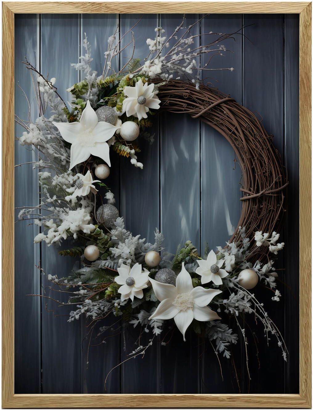 Plakat o nazwie "Magia Świąt" przedstawia świąteczny wieniec, idealnie wpisujący się w zimową atmosferę świąt. Użyte w nim delikatne odcienie bieli i szarości nadają mu elegancki wygląd, wprowadzając subtelną magię świątecznego okresu do wnętrza. Jego stonowana kolorystyka i minimalistyczny styl tworzą harmonijną całość, dodając wnętrzu ciepła i spokoju. Plakat może pełnić rolę centralnego elementu dekoracyjnego w Twoim domu lub biurze. Dzięki uniwersalnym kolorom, doskonale pasuje do różnych stylów aranżacji, takich jak boho, minimalistyczny czy klasyczny.