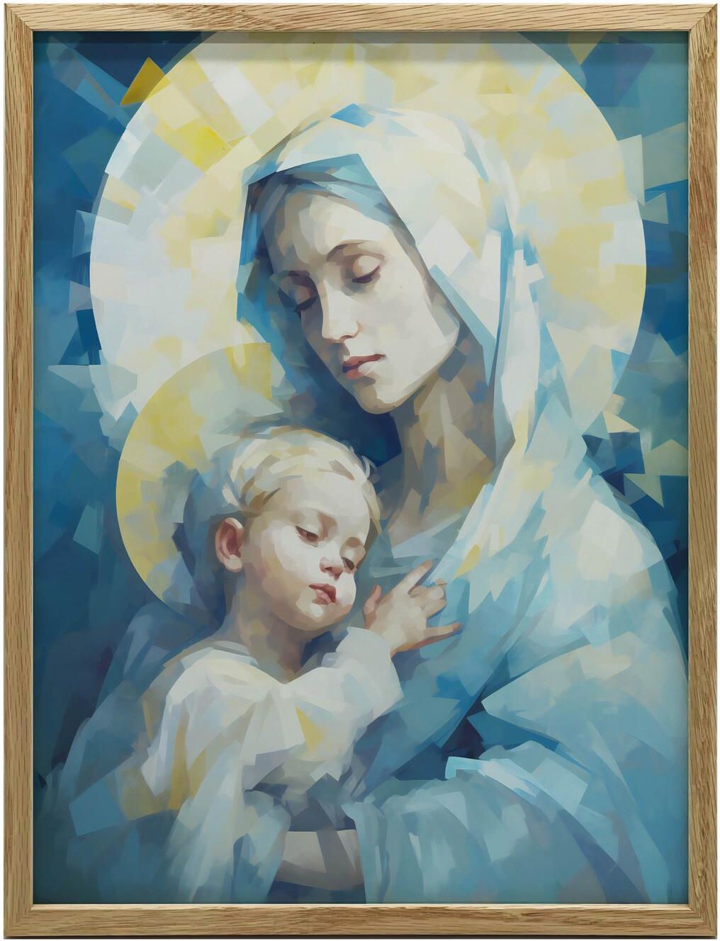 Obraz „Matczyna Miłość” przedstawia Maryję trzymającą Dzieciątko Jezus w nowoczesnym stylu cyfrowym. Użycie niebieskich i żółtych odcieni nadaje mu współczesny charakter, łącząc tradycję z nowoczesnością. Maryja jest ukazana z miłością i czułością, co emanuje spokojem i wzruszeniem, podkreślając jej bliski związek z Dzieciątkiem. Kolory i kompozycja obrazu tworzą duchową atmosferę, przyciągającą uwagę i wnoszącą inspirację do każdego wnętrza. To wyjątkowy wybór na prezent religijny, idealny na takie okazje jak Komunia Święta czy chrzciny, przypominający o matczynej miłości i świętości chwili.