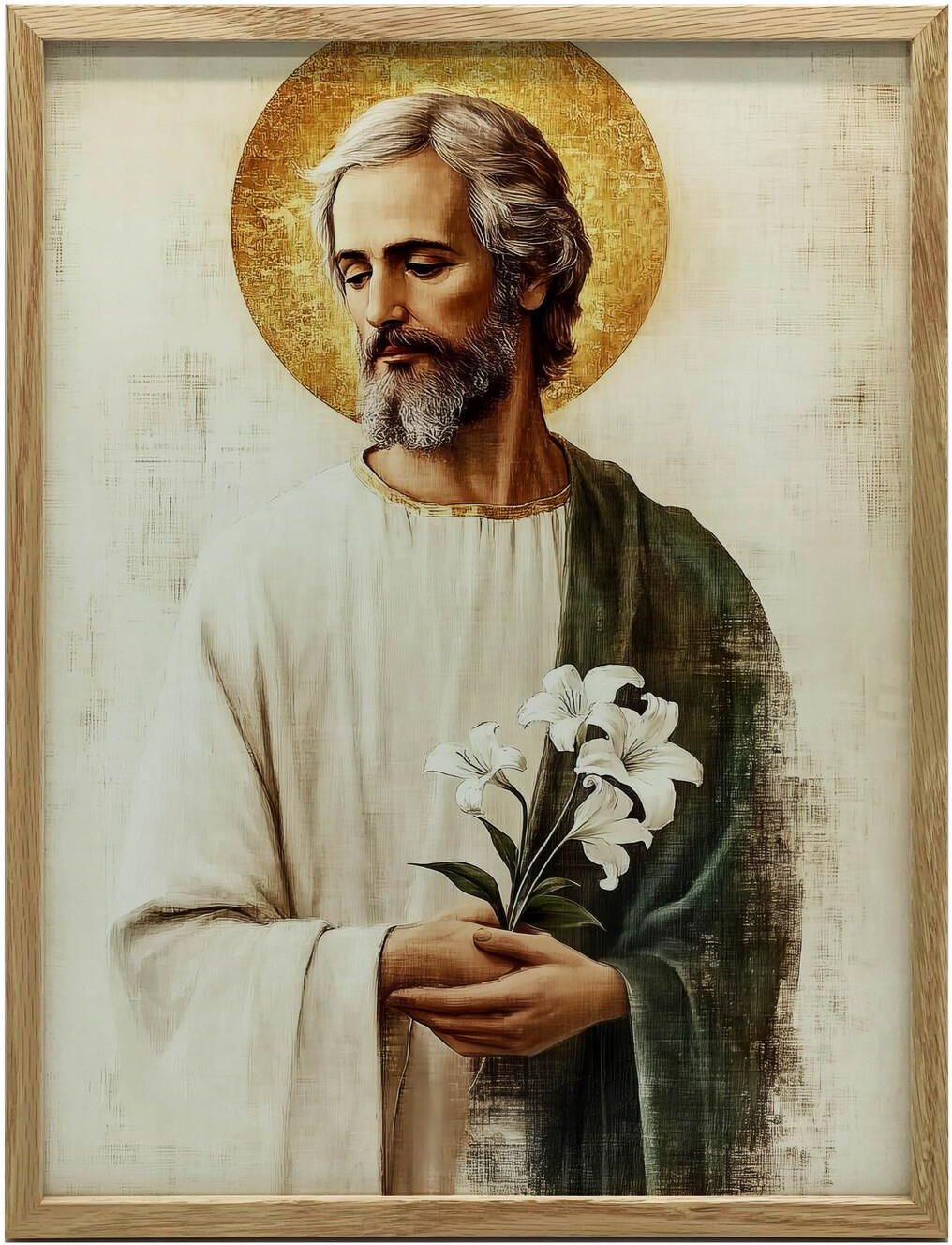 Plakat zatytułowany "Święty Józef z bukietem lilii" przedstawia postać świętego Józefa, który trzyma w dłoniach bukiet białych lilii, symbolizujących czystość i niewinność. Józef jest ubrany w białą szatę oraz zielony szal, co nadaje mu dostojny wygląd i podkreśla duchowy charakter całej ilustracji. Tło plakatu ma delikatny beżowy odcień, a wokół głowy Świętego znajduje się subtelna złota aureola, która podkreśla jego świętość i bliskość do Boga. Ten plakat świetnie sprawdzi się w każdym miejscu o duchowym znaczeniu, tworząc atmosferę modlitwy i refleksji. Idealnie nadaje się do kaplicy, pokoju modlitewnego bądź sypialni.