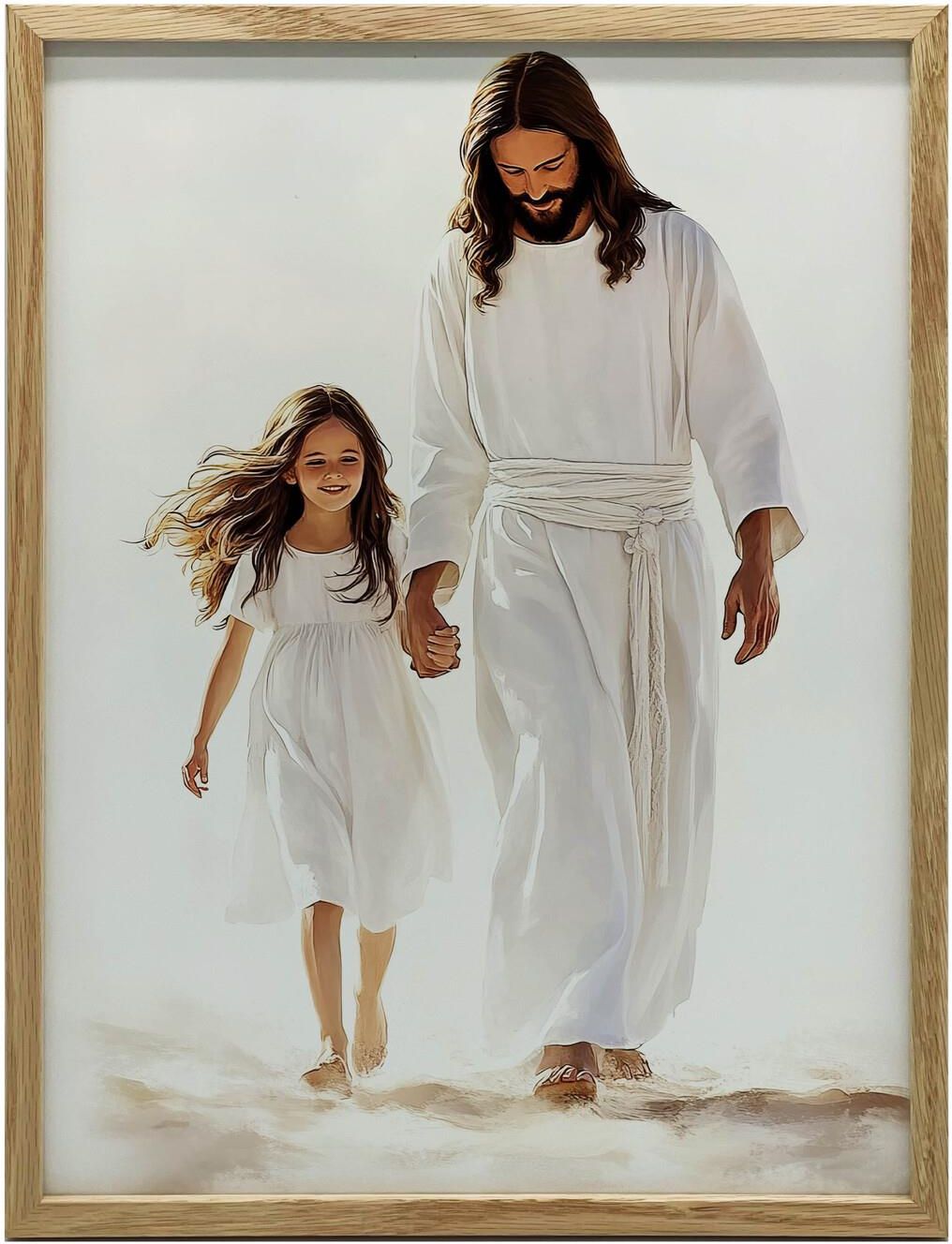 Plakat "Wspólna Droga z Jezusem" to piękna ilustracja, na której Jezus trzyma za rękę radosną dziewczynkę w białej sukience. Cała kompozycja emanuje szczęściem i ciepłem, co doskonale oddaje bliskość oraz dziecięcą niewinność. Delikatne, miękkie światło oraz neutralne tło tworzą harmonijną scenerię, a realistyczny styl uwydatnia detale postaci.Ten plakat stanowi doskonałą pamiątkę na Pierwszą Komunię Świętą, chrzest lub inne ważne momenty w życiu dziecka. Wizerunki Jezusa i dziewczynki wprowadzają do wnętrza atmosferę miłości, spokoju oraz duchowej głębi, czyniąc go idealnym elementem dekoracyjnym do pokoju dziecięcego.