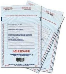 Koperta bezpieczna C3, biała, Amersafe, 310x465+35 Koperty bezpieczne, wykonane z folii PE, z bezpiecznym zamknięciem samoklejącym do przesyłek wartościowych i tajnych. Koperty bezpieczne z folii PE z czarnym poddrukiem zabezpieczającym. Posiadają zamknięcie, które natychmiast uwidacznia próby ingerencji. Dodatkowy numerator pozwala na dokładną identyfikację przesyłki i śledzenie jej drogi w trakcie procesu przesyłania, a także spełnia rolę pokwitowania w postaci łatwo odrywanego kuponu. Koperty bezpieczne mają zastosowanie przede wszystkim w bankach i innych instytucjach finansowych, agencjach ochrony, hotelach, sklepach, stacjach benzynowych oraz w firmach do przewożenia i przechowywania pieniędzy, biżuterii, akt osobowych, tajnych dokumentów i projektów, nośników danych, kart kredytowych, kluczy do chronionych pomieszczeń (i innych depozytów).