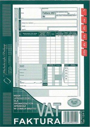 Faktura VAT Michalczyk i Prokop A5 pion 124-3E. Wzór uproszczony dla prowadzących sprzedaż w cenach brutto. zastosowanie: faktury i inne dokumenty wynikające z przepisów o podatku od towarów i usług. Cechy:- Typ: 124-3E;- Format A5 pion;- Rodzaj papieru: samokopiujący;- Oprawa: bloczek 80 kartek;- Druk: jednostronny (oryginał + kopia).