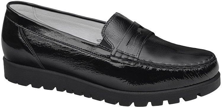 Mokasyny WALDLAUFER 549002 schw Cena: 449.00 zł Rozmiar: 37,5 Półbuty typu mokasyn to markowe obuwie Waldlaufer wykonane z mięciutkiej skóry lakierowanej. Buty te charakteryzuje gruba podeszwa ,wyciągana profilowana wkładka. Obuwie polecane wymagającym paniom również z haluksami, szukającym butów na co dzień. Tęgość: H (szeroka) Kolor: Czarny Kolory producenta: SCHWARZ Wysokość obcasa: 0 - 3 cm Materiał cholewki: skóra naturalna
