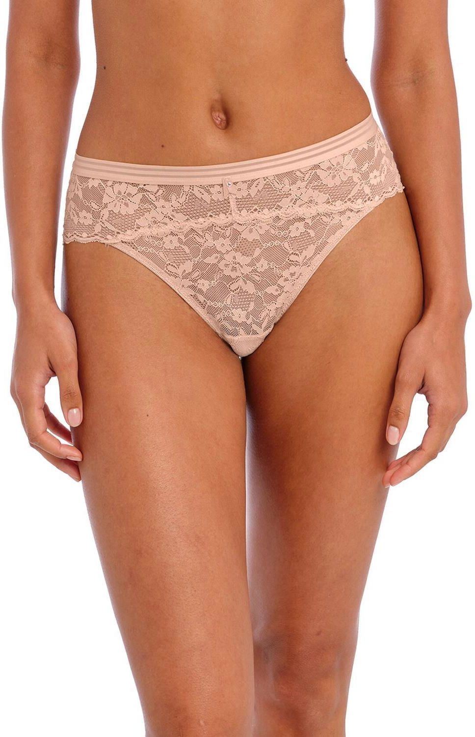 piękne koronkowe figi z głębszym wycięciem na biodrach, elegancka lamówka wokół talii, zdobiona uroczą kokardką, z tyłu efektowne wycięcie.