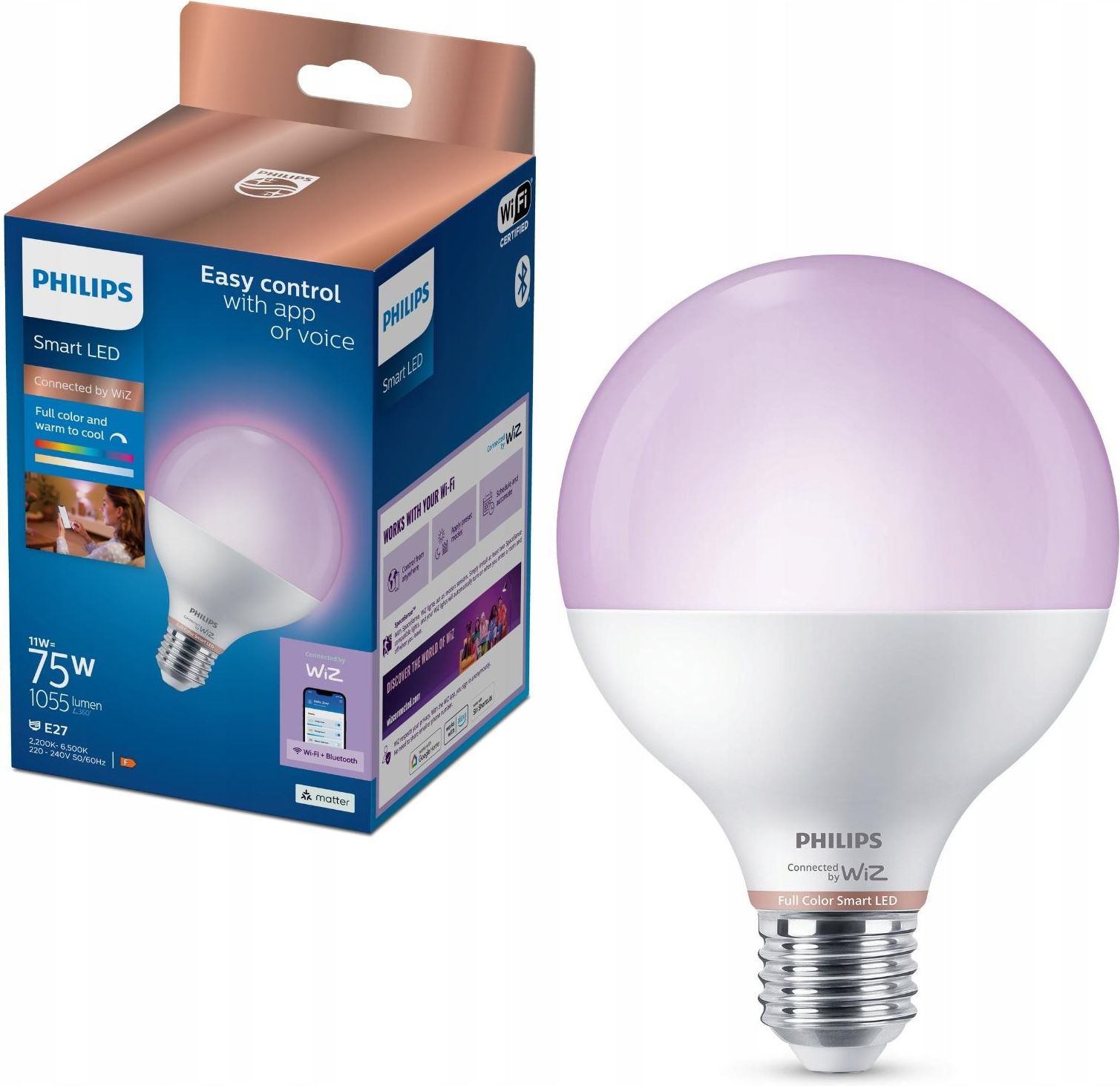 Philips Smart LED Żarówka E27 G95 11 W (75 W), kolorowe światło Zainstaluj wokół siebie oświetlenie stworzone z myślą o ludziach dzięki inteligentnej żarówce WiZ LED w kształcie kuli. Stosuj różne odcienie bieli od ciepłej do zimnej, by łatwiej się skoncentrować lub zrelaksować. Możesz ustawić …