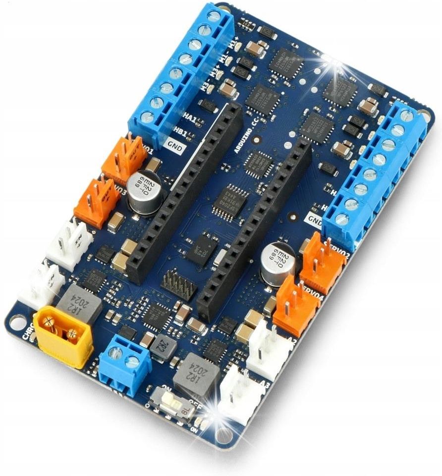Arduino Nano Motor Carrier - sterownik silników do Arduino Nano 33 IoT - ABX00041 Nakładka zawierająca sterownik silników DC oraz czujnik IMU, przeznaczona do modułu Arduino Nano 33 IoT. Zaprojektowana została w celu ułatwienia uczniom prototypowania i tworzenia własnych projektów z wykorzystaniem silników DC. Płytka wyposażona została również w 3-pinowe złącza do podłączenia innych modułów, cztery złącza serw, dwa porty enkoderów oraz 9-osiowy akcelerometr, żyroskop i magnetometr. Na płytce Nano Motor Carier Board znajduje się również układ ładowarki akumulatorów jednocelowych Li-Ion. Indeks: ARD-20396 Specyfikacja sterownika silników Arduino Mikrokontroler: ATSAMD11 ARM Cortex M0+ 48 MHz Układ sterownika silników: MP6522 Ilość kanałów 4 Maksymalne napięcie wejściowe: 4 V (1S Li-Ion) Maksymalny prąd na kanał: 500 mA Napięcie zasilania silników: 12 V Układ ładowarki akumulatorów Maksymalny prąd ładowania: 500 mA (konfigurowany) Złącza zasilania: XT-30, terminale 2POS Złącze serwo: 4 terminale Wejścia enkoderów: 2 porty Wejścia / wyjścia czujników analogowych / cyfrowych 3 V: 4 porty IMU: BN0055 9 osi, akcelerometr / żyroskop / magnetometr Wymiary: 80 x 60 mm Masa: 35 g