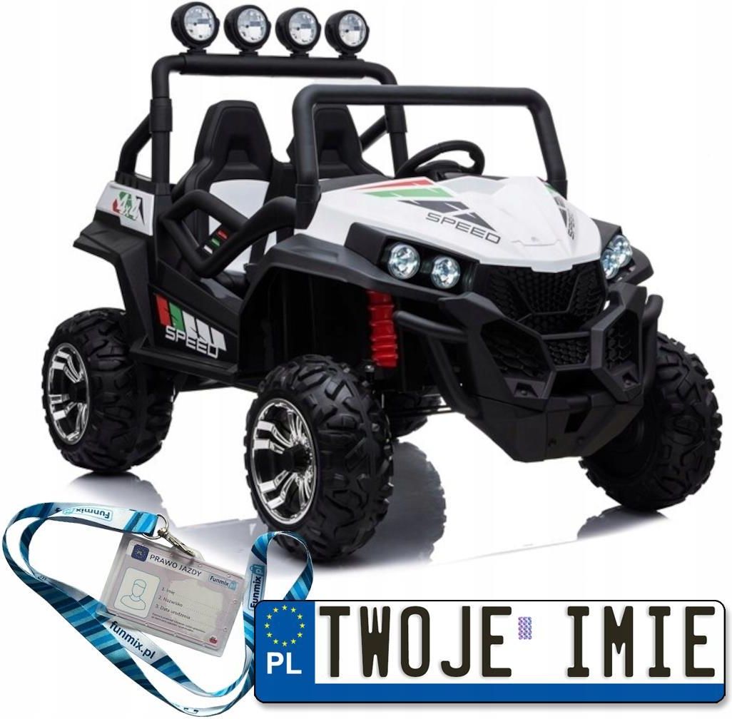 Auto na Akumulator Buggy S2588 Białe Specyfikacja Model: S2588 Kolor: Biały Napęd: 4x45W Akumulator: 2x12V7Ah Skrzynia Biegów: 3 Prędkości Wymiary Pojazdu: 136cm x 93cm x 104cm Prędkość: 3-5 km/h Masa Własna: 27 kg Max. Obciążenie: 59kg Czas Ładowania: 8 godzin Czas Działania: do 1 godziny Hamulec: Automatyczny po zwolnieniu pedału gazu, Zatrzymanie awaryjne z pilota (P) Pasy Bezpieczeństwa: + Otwierane Drzwi: + Kluczyki: X Fotele: Ekoskóra Koła: Miękkie EVA Zdalne Sterowanie: 2.4G, 3 prędkości Światła: Przednie LED Audio: Wejście MP3, Mikro SD, Możliwość wyboru źródła dźwięku, Bluetooth Długość towaru w centymetrach: 95 Wysokość towaru w centymetrach: 140 Szerokość towaru w centymetrach: 60 Waga gabarytowa w gramach: 133000 Kod producenta: 5905991025931 Tablice rejestracyjne do pojazdów dla dzieci z imieniem dziecka + prawo jazdy + smycz i identyfikator na prawo jazdy Tablice dla większej trwałości drukowane są na papierze fotograficznym, a z tyłu podklejane mocną taśmą dwustronną. Są uniwersalnej wielkości pasującej do większości pojazdów dla dzieci - ok 13,7 cm x 3,2 cm. Zestaw oczywiście zawiera dwie sztuki. Prawo jazdy jest wielkości oryginalnego ok 85,6 mm x 54 mm z miejscem na wklejenie zdjęcia i podanie danych dziecka wraz z posiadanymi uprawnieniami. Aby nie była to chwilowa zabawka, która zaraz się zniszczy lub zginie w zestawie dodajemy identyfikator do którego montujemy prawo jazdy, a następnie identyfikator przypinamy do smyczki, którą również jest w zestawie. Taki komplet dziecko może nosić na szyi. Smycz jest wysokiej jakości z dwustronnym nadrukiem - nie jak w przypadku tańszych gdzie druga strona jest w całości biała co wygląda nieestetycznie i ulega szybkiemu zabrudzeniu. Wytyczne użytkowania pojazdu dla dzieci na akumulator Czas ładowania motorka wynosi 8 do 10 godzin. Prawidłowo użytkowany akumulator nie powinien być przetrzymywany po rozładowaniu, dłużej niż dobę, ponieważ może znacznie się skrócić jego żywotność. Przed pierwszym uruchomieniem, należy zapoznać się z instrukcją.