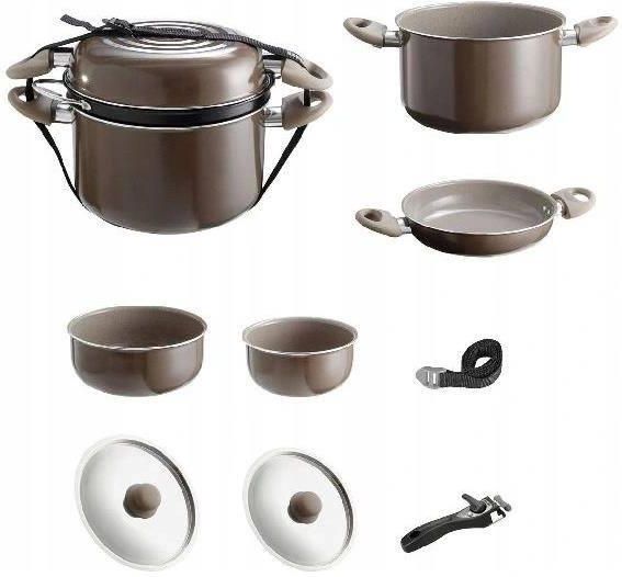 Garnki kempingowe zestaw Chocolate 7+1 Brunner Garnek Garnki do gotowania makaronu - EuroTrail Zestaw garnków turystycznych do gotowania Chocolate firmy Brunner Idelane na kemping, podróż kamperem, na łódkę, biwak Doskonałej jakości, wykonane z aluminium Posiadają inowacyjną wewnętrzną powłokę …