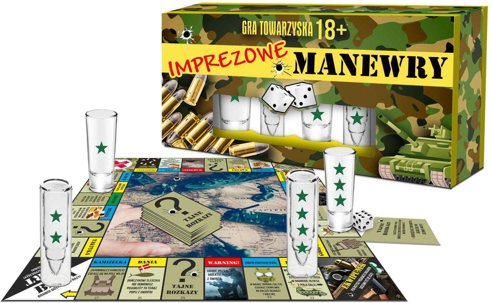 Opis gry Imprezowe Manewry Przygotuj się na niezapomniane chwile pełne emocji i rywalizacji! Gra Imprezowe Manewry to wyjątkowa propozycja, która z pewnością urozmaici każdą imprezę. Co zawiera zestaw? 4 kieliszki, które pełnią rolę pionków Kostka do gry Plansza do rozgrywki Karty z tajnymi rozkazami Jak grać? Rozpocznij grę, umieszczając kieliszki na planszy. Rzuć kostką i poruszaj się zgodnie z poleceniami, które znajdziesz na polach planszy. Wykonuj tajne rozkazy, aby zyskać przewagę nad przeciwnikami. Cel gry Wygrywa gracz, który jako pierwszy dotrze do bazy. To idealna gra na wieczory z przyjaciółmi, która dostarczy mnóstwo śmiechu i radości! Dodatkowe informacje Wiek graczy: od 18 lat Liczba graczy: 3 - 6 Czas rozgrywki: około 60 minut Graj w Imprezowe Manewry i odkryj, jak wiele radości może przynieść wspólna zabawa!