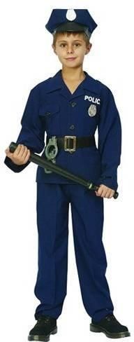 Strój policjanta USA rozm.120/130cm Materiał: 100% poliester Producent: Godan S.A. Koszula: Długość całkowita: 56 cm Szerokość pod pachami: 42 cm Długość rękawa: 46 cm Spodnie + pasek: Długość nogawki: 81 cm Szerokość w pasie: 23 Szerokość nogawki: 18 cm Szerokość paska: 35 cm Strój policjanta został wykonany z wysokiej jakości elastycznego poliestru. Koszula wraz ze spodniami w kolorze granatowym. Pasek w kolorze czarnym zawiera złotą aplikację. Na koszuli zawarty jest napis ""POLICE"" i policyjna odznaka. Strój zawiera: koszula, pasek policjanta, spodnie, policyjna czapka.