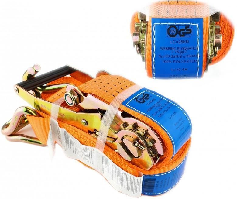 Profesjonalny pas mocujący AKC5008 jest niezawodnym narzędziem do zabezpieczania ładunków, zaprojektowanym zgodnie z normami europejskimi, co gwarantuje najwyższą jakość i bezpieczeństwo użytkowania. Idealny dla profesjonalistów wymagających solidnych i trwałych rozwiązań mocujących. Specyfikacja Produktu Materiał: 100% polyester Kolor: Pomarańczowy Szerokość: 50 mm Długość Kompletna: 8 m Zdolność Mocowania (LC): 2500 daN Wydłużenie Taśmy: 7% Siła Trzymająca Stała (STF): 300 daN Siła Trzymająca Ręczna (SHF): 50 daN Certyfikaty: PN-EN 12195-2:2000, AfPS GS 2004:01 PAK Właściwości Produktu Bezoprawkowa Konstrukcja: Zakończony hakami „podwójny pazur” Elastyczność: Elastyczny mostek dla komfortowego dopasowania Przyczepność: Gumowe końcówki zauszników Bezpieczeństwo: Nieprzewodząca oprawka z materiału izolacyjnego Ochrona: Uniwersalne zastosowanie w różnych branżach Instrukcja Użytkowania Nie używać pasów jako zawiesia. Nie przekraczać obciążenia LC. Używać co najmniej dwóch pasów do mocowania opasaniem i czterech jako odciągi. Pasy muszą być nieuszkodzone i bez widocznych wad. Napinanie: wprowadzić taśmę od spodu, ręcznie przyciągnąć, mocno napinać ruszając uchwytem tam i z powrotem, nawinąć 1,5 do 3 zwojów. Zabezpieczyć napinacz przed podróżą. Zalecenia Dotyczące Bezpieczeństwa Regularnie sprawdzać pasy na obecność uszkodzeń. Wycofać z użycia pasy z widocznymi uszkodzeniami, przecięciami, odkształceniami, korozją lub brakującą/nieczytelną etykietą. Oczyszczać pasy przepłukując tylko wodą. Temperatury pracy dla PES: od -40 °C do 120 °C.