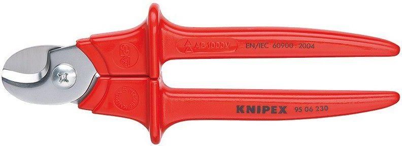 KNIPEX Nożyce izolowane do cięcia kabli (95 06 230 SB). Charakterystyka produktu: do cięcia kabli Cu i Al, nieodpowiednie do cięcia drutu stalowego oraz drutu miedzianego ciągnionego na zimno, precyzyjnie wykończone, hartowane ostrza, cięcie bez miażdżenia, nieznaczna deformacja kabla, bezpieczny …