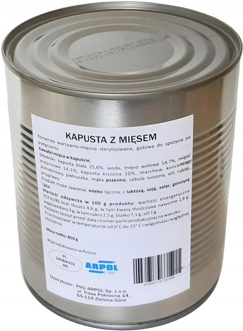 Ten opis został przetłumaczony maszynowo z oryginalnego tekstu. Wojskowe konserwy Arpol zapewniają łatwy sposób na jedzenie i uzupełnianie energii w dowolnym miejscu w terenie. Aby podgrzać jedzenie, należy rozpalić ognisko lub użyć zewnętrznego podgrzewacza. Jest to pełnowartościowy posiłek przygotowany z wysokiej jakości składników. Posiłki w puszkach charakteryzują się łatwym przechowywaniem i bardzo długim okresem przydatności do spożycia, co można również znaleźć na spodzie partii produkcyjnej Kapusta z mięsem to idealny posiłek dla dwóch osób. Sterylizowane warzywa i mięso w puszkach, gotowe do spożycia po podgrzaniu Składniki: Kapusta biała 25,6 %, woda, mięso wołowe 14,7 %, mięso wieprzowe 14,1 %, kapusta kiszona 10 %, marchew, koncentrat pomidorowy koncentrat pomidorowy, natka pietruszki, mąka pszenna, cebula suszona, sól, cukier, przyprawy. Produkt może zawierać mleko łącznie z laktozą, soję, seler, jaja i gorczycę. Wartość odżywcza na 100 g produktu: energia 353 kJ/85 kcal; tłuszcz 4,6 g, w tym kwasy tłuszczowe nasycone 2,8 g; węglowodany 3 g, w tym cukry 2,5 g; białko 7,1 g; sól 1 g. Przygotowanie do spożycia: otworzyć produkt, wlać zawartość puszki do rondla i podgrzewać na małym ogniu, od czasu do czasu mieszając, lub podgrzewać zamkniętą puszkę w rondlu z wrzącą wodą przez około 30-40 minut. Przechowywać w temperaturze od 0 C do 25 C i wilgotności względnej otoczenia. Wyprodukowano w Polsce Waga netto: 850 g Termin przydatności do spożycia: 3 maja 2025 r.