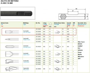 Dłuto płaskie wąskie 25mm x 400mm 19/19 HEX 19 Numer katalogowy 203 40000 - niemieckiego producenta firmy RENNSTEIG Dłuto płaskie wąskie 25mm z końcówką 19/19mm 400mm niemieckiej firmy RENNSTEIG. Dłuto płaskie 203 40000 do ogólnych prac związanych z kuciem i prac rozbiórkowych w murze, betonie i luźnym kamieniu drobne prace związane z usuwaniem materiału ukierunkowany efekt wyłamania z wysokostopowej stali narzędziowej hartowany na wskroś zapewnia maksymalne przenoszenie siły uderzenia ostrze może być ponownie ostrzone spełnia/przewyższa wymagania aktualnych norm (np. DIN) Współpracuje z elektronarzędziami: UWAGA! - TYLKO z modelami które współpracują z pokazanym na zdjęciu chwytem HEX 19 Opis: Zastosowanie w młotach z uchwytem HEX 19 z funkcją kucia. Technologia wykonania firmy RENNSTEIG oznacza dłuższą żywotność i większą wydajność usuwania materiału. Dane techniczne: Długość całkowita: 400mm Ostrze dłuta: szpic RENNSTEIG to renomowana marka specjalizująca się w produkcji narzędzi ręcznych wysokiej jakości. Znana ze swojej doskonałej precyzji i trwałości, RENNSTEIG oferuje szeroką gamę narzędzi do różnych zastosowań, w tym narzędzi do cięcia, zginania i zdejmowania izolacji. Marka ta cieszy się uznaniem profesjonalistów z wielu branż, takich jak elektronika, przemysł motoryzacyjny, instalacje elektryczne i wiele innych. Dzięki innowacyjnemu podejściu do projektowania i produkcji narzędzi, RENNSTEIG jest pewnym wyborem dla osób poszukujących niezawodnych i wytrzymałych narzędzi. RENNSTEIG specjalizuje się w produkcji dłut do elektronarzędzi. Produkty firmy RENNSTEIG sprzedawane są pod różnymi markami innych producentów narzędzi.