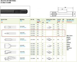 Dłuto grot zbieżny 400mm 19/19 Numer katalogowy 203 40001 - niemieckiego producenta firmy RENNSTEIG Grot zbieżny - szpicak - z końcówką 19/19mm 400mm niemieckiej firmy RENNSTEIG. Dłuto szpicak 203 40001 do ogólnych prac związanych z kuciem i prac rozbiórkowych w murze, betonie i luźnym kamieniu drobne prace związane z usuwaniem materiału ukierunkowany efekt wyłamania z wysokostopowej stali narzędziowej hartowany na wskroś zapewnia maksymalne przenoszenie siły uderzenia ostrze może być ponownie ostrzone spełnia/przewyższa wymagania aktualnych norm (np. DIN) Współpracuje z elektronarzędziami: UWAGA! - TYLKO z modelami które współpracują z pokazanym na zdjęciu chwytem HEX 19 Opis: Zastosowanie w młotach z uchwytem HEX 19 z funkcją kucia. Technologia wykonania firmy RENNSTEIG oznacza dłuższą żywotność i większą wydajność usuwania materiału. Dane techniczne: Długość całkowita: 400mm Ostrze dłuta: szpic RENNSTEIG to renomowana marka specjalizująca się w produkcji narzędzi ręcznych wysokiej jakości. Znana ze swojej doskonałej precyzji i trwałości, RENNSTEIG oferuje szeroką gamę narzędzi do różnych zastosowań, w tym narzędzi do cięcia, zginania i zdejmowania izolacji. Marka ta cieszy się uznaniem profesjonalistów z wielu branż, takich jak elektronika, przemysł motoryzacyjny, instalacje elektryczne i wiele innych. Dzięki innowacyjnemu podejściu do projektowania i produkcji narzędzi, RENNSTEIG jest pewnym wyborem dla osób poszukujących niezawodnych i wytrzymałych narzędzi. RENNSTEIG specjalizuje się w produkcji dłut do elektronarzędzi. Produkty firmy RENNSTEIG sprzedawane są pod różnymi markami innych producentów narzędzi.