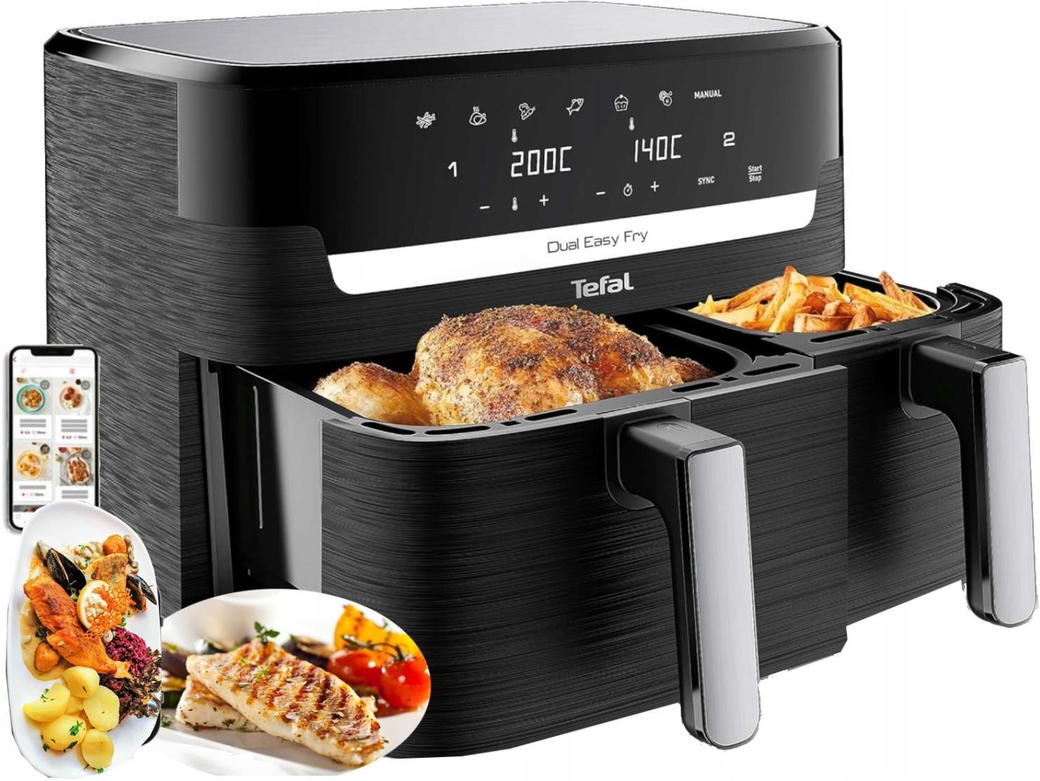 Tefal EY901810 Odkryj nowy wymiar zdrowego i szybkiego gotowania z Tefal Air Fryer Dual Easy Fry - frytkownicą beztłuszczową o mocy 2700 W i imponującej pojemności 8,3 l. Dzięki dwóm niezależnym komorom możesz przygotować dwa różne posiłki jednocześnie, oszczędzając czas i energię. Zaawansowana technologia Extra‑Crisp gwarantuje chrupkość z minimalną ilością tłuszczu - nawet o 99 % mniej niż w tradycyjnej metodzie smażenia. To idealne rozwiązanie dla całej rodziny - smaczne, szybkie, bez kompromisów dla zdrowia. Kompletny rodzinny posiłek w kilka minut Dwukomorowa frytkownica na gorące powietrze z dwiema niezależnymi szufladami, szufladą XXL i normalną szufladą do gotowania dwóch różnych potraw jednocześnie - dla pełnego posiłku w jednym cyklu. Pojemność w rozmiarze rodzinnym Użyj szuflady XXL o pojemności 5,2 litra, aby przygotować duże składniki, takie jak niedzielna pieczeń, obie szuflady na duże porcje frytek lub 3,1 l szuflady, jeśli jesteś sam i chcesz zaoszczędzić energię. Relaksujące gotowanie 7 wstępnie ustawionych programów (frytki, kurczak, warzywa, ryby, deser, suszenie i tryb ręczny) do smażenia, pieczenia i grillowania – idealne do gotowania wielu potraw bez nadzoru i bez dodatkowego tłuszczu/oleju. Łatwe czyszczenie Bezproblemowe czyszczenie dzięki podwójnym szufladom nadającym się do mycia w zmywarce i rusztem.