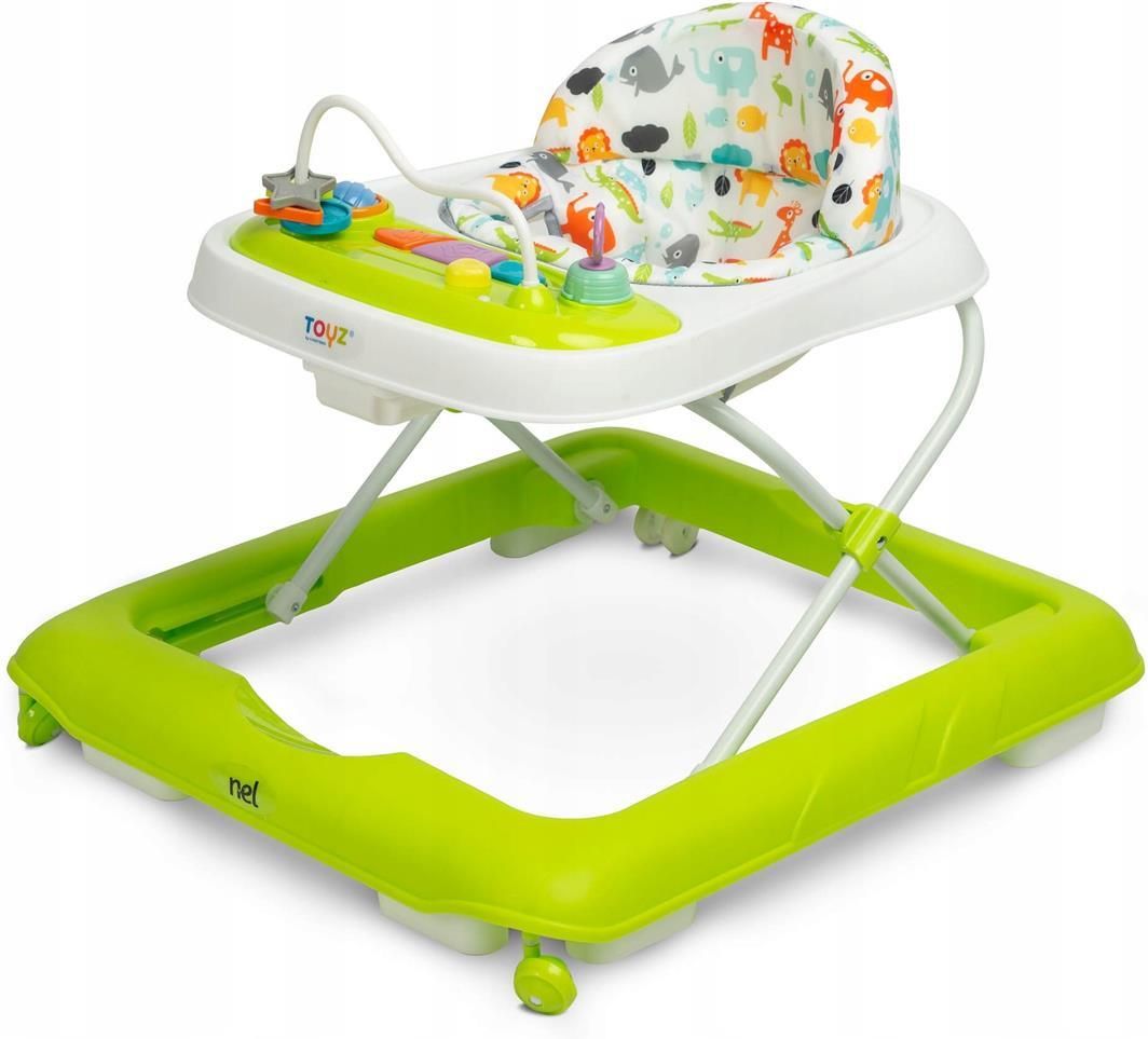 Nel to przystępny cenowo i stylowy chodzik dla maluchów marki Toyz. Wyróżnia go elegancka kolorystyka i wygoda użytkowania. Specjalna konstrukcja umożliwia dopasowanie położenia siedziska do wysokości malucha – tak, by stópki swobodnie dotykały podłoża. Wyposażony jest w dźwiękowy panel zasilany bateriami i manualne zabawki, które zapewniają dobrą zabawę. Najważniejsze cechy: korzystny stosunek niskiej ceny i wysokiej jakości wykonania, panel dźwiękowy, który można wypiąć i który zawiera szereg zabawek manualnych, wyprofilowane siedzisko i usztywnione oparcie zapewniające prawidłowe ułożenie dziecka, możliwość złożenia chodzika na płasko, możliwość dopasowania wysokości siedziska do wzrostu dziecka – w zakresie od 22 cm do 26 cm, przednie skrętne kółka, które ułatwiają swobodne manewrowanie, gumowe stopery zapobiegające wjechaniu na nierówny teren czy spadnięciu z wysokiego progu, jasną instrukcję i prosty montaż. Przedział wiekowy od 6 miesięcy do 12 kg Wymiary: 68 x 59 x 54 cm Waga netto: 3,6 kg Waga brutto: 4,4 kg