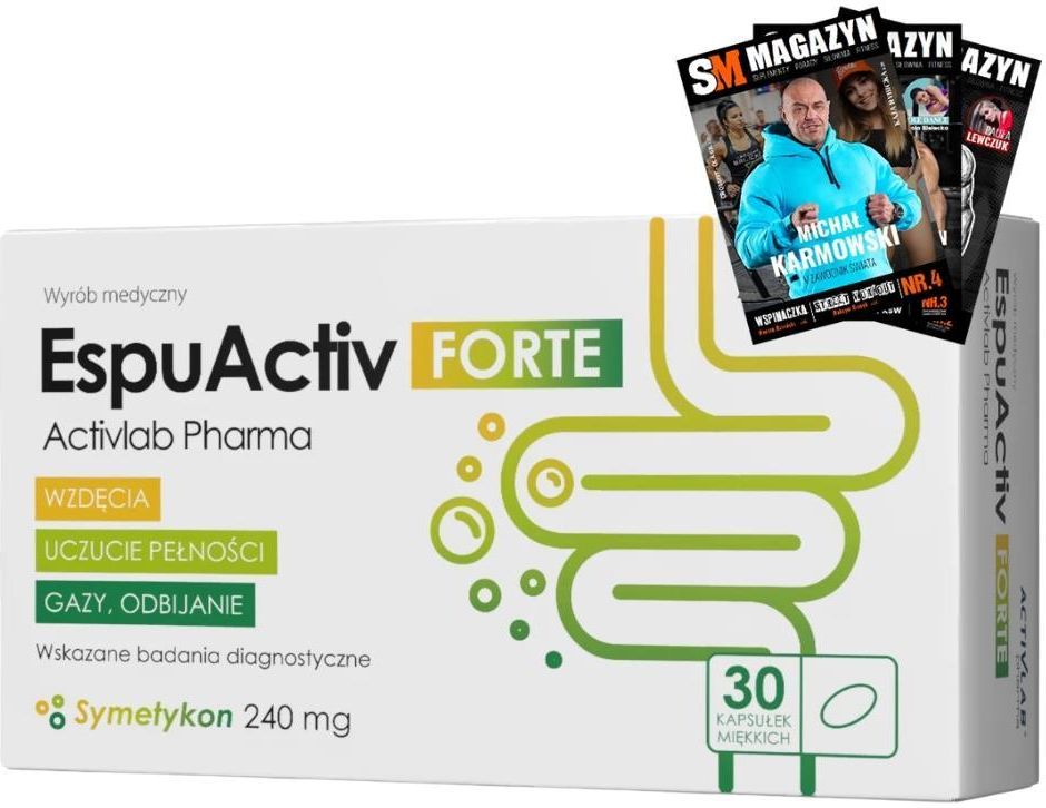 ACTIVLAB EspuActiv Forte 30 kaps Cechy suplementu ACTIVLAB EspuActiv Forte 30 kaps Pomaga usunąć nadmiar gazów z układu trawiennego. Łagodzi wzdęcia i poprawia komfort trawienia. Opiera się na składnikach aktywnych o sprawdzonym działaniu. Przeznaczony dla osób z wrażliwym układem pokarmowym. Wygodne kapsułki ułatwiają codzienne stosowanie. Opis produktu ACTIVLAB EspuActiv Forte 30 kaps to innowacyjny suplement diety zaprojektowany dla osób borykających się z dolegliwościami trawiennymi, takimi jak wzdęcia czy uczucie pełności. Skutecznie usuwa nadmiar gazów, przynosząc ulgę i redukując napięcie w jamie brzusznej. Dzięki starannie dobranym składnikom aktywnym, produkt działa szybko i efektywnie, wspierając naturalne procesy trawienia. Jest idealnym rozwiązaniem zarówno dla osób z przewlekłymi dolegliwościami, jak i tymczasowymi problemami trawiennymi. Łatwość stosowania w formie kapsułek zapewnia wygodę użytkowania o dowolnej porze dnia. EspuActiv Forte charakteryzuje się naturalnym składem, wolnym od sztucznych dodatków, co czyni go odpowiednim dla osób o wrażliwym układzie trawiennym. Regularne stosowanie suplementu wspiera równowagę w układzie pokarmowym, poprawiając ogólny komfort życia. Produkt ten jest dedykowany każdemu, kto szuka szybkiego, skutecznego i bezpiecznego wsparcia w łagodzeniu dolegliwości żołądkowych. Jego skuteczność została potwierdzona, a łatwa forma stosowania sprawia, że jest niezastąpionym elementem dbania o zdrowie trawienne. Dzięki EspuActiv Forte radzenie sobie z codziennym dyskomfortem staje się prostsze i bardziej efektywne. Dla kogo jest ten produkt ACTIVLAB EspuActiv Forte 30 kaps jest stworzony dla osób, które odczuwają dyskomfort związany z wzdęciami, napięciem brzusznym czy gazami. Dedykowany jest również tym, którzy zmagają się z wrażliwością układu pokarmowego i chcą poprawić jego funkcjonowanie. To idealny wybór dla osób potrzebujących szybkiego i niezawodnego wsparcia w radzeniu sobie z dolegliwościami trawiennymi. Suplement jest odpowiedni zarówno dla tych, którzy okazjonalnie zmagają się z tym problemem, jak i tych, którzy potrzebują stałego wsparcia w utrzymaniu komfortu trawiennego. [TABELA SKŁADNIKÓW AKTYWNYCH] Składniki Opakowanie: 30 kapsułek softgel Porcja:1 kapsułka Liczba porcji w opakowaniu: 30 Sposób użycia Dorośli: doraźnie, 1 kapsułka, 2–4 razy dziennie. Maksymalnie 4 kapsułki dziennie (960 mg symetykonu). Kobiety w ciąży: dawkowanie i sposób użycia według zaleceń lekarza lub farmaceuty. U osób chorych na cukrzycę nie jest wymagana zmiana dawkowania. Dzieci od 12 do 18 roku życia: doraźnie, 1 kapsułka dziennie.. Przeciwwskazania Nie zaleca się stosowania przez kobiety w ciąży, matki karmiące piersią oraz osoby uczulone na którykolwiek ze składników produktu. Suplement diety nie może być substytutem (zamiennikiem) zdrowego trybu życia. Nie przekraczać zalecanej dziennej porcji. Przechowywanie Przechowywać w suchym i ciemnym miejscu niedostępnym dla małych dzieci. Podmiot odpowiedzialny:REGIS Sp. z.o.o. NIP: 683-000-75-37 "REGIS Sp. z o.o. ul. Walerego Sławka 3a 30-633 Kraków" DO KAŻDEGO ZAMÓWIENIA OTRZYMUJESZ GRATIS! SM MAGAZYN - VIDEOBOOK DLA MIŁOŚNIKÓW SPORTU Wywiady z ikonami sportu Treningi z najlepszymi w swojej dziedzinie Diety Poradniki Ciekawostki Robiąc zakupy otrzymujesz nielimitowany dostęp do darmowej prenumeraty SM Magazyn, który wysyłamy do Ciebie w formie elektronicznej po opłaceniu zamówienia. Każdy numer to ponad 80 stron! Otrzymujesz także dostęp do pełnego archiwum! Jesteśmy autorem oraz wydawcą videobooka SM Magazyn. Dzieło zarejestrowane pod ISBN: 978-83-955667-1-4