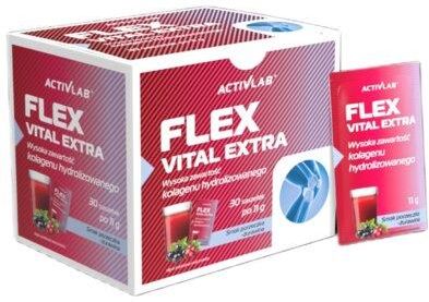 Suplement diety Flex Vital Extra marki ACTIVLAB to suplement diety o wysokiej zawartości kolagenu hydrolizowanego w postaci proszku o pysznym porzeczkowo żurawinowym smaku.