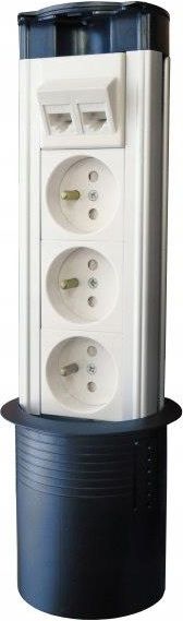 Wpuszczana kolumna do blatu zasilająca 3 gniazda elektryczne + 2 gn. LAN ALANTEC Kolumna zasilająca meblowa, do blatu, umożliwia estetyczną dystrybucję zasilania elektrycznego i portów logicznych. Jest przeznaczona do bezpośredniego montażu w blatach mablowych. Konstrukcja pozwala na całkowite schowanie kolumny w blacie. Posiada wbudowane 3 gniazda zasilające 230V oraz dwa gniazda komputerowe RJ45. Wygoda użytkowania Po naciśnięciu wierzchu kolumna wysuwa się ponad blat biurka. Trzy gniazda zasilające 230V o łącznej obciążalności 16A pozwalają na wygodne podłączanie odbiorników elektrycznych. Dwa porty RJ45 umożliwiają szybką transmisję danych. Po skończonej pracy można schować kolumnę w obrys biurka. Podłączenie do sieci elektrycznej jest realizowane za pomocą wbudowanego kabla o długości 1,8m. Cechy produktu średnica otworu montażowego: 80 mm wysokość całkowita: 290 mm dwa porty RJ45 trzy gniazda zasilające 230V estetyczna i wygodna dystrybucja zasilania Marka » ALANTEC ALANTEC to marka należąca do firmy A-LAN Technologie, polskiego producenta systemów okablowania strukturalnego. A-LAN działając od 2001 roku, ugruntował sobie pozycję lidera, wprowadzając na rynek produkty najwyższej jakości, weryfikowane przez niezależne laboratoria, dając tym samym gwarancję trwałości i niezawodności. Firma rocznie wprowadza na rynek europejski kilkadziesiąt tysięcy kilometrów kabli teleinformatycznych, kilkaset tysięcy gniazd abonenckich oraz dziesiątki tysięcy komponentów towarzyszących, dając na te produkty wieloletnie gwarancje systemowe.