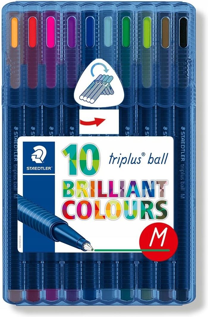 Długopis triplus ball M 10 kolorów STAEDTLER Staedtler __________________________________________________________________ Ergonomiczna obudowa o przekroju w kształcie trójkąta zapewnia wyjątkowy komfort pisania. Lekkie i gładkie pisanie. Grubość linii pisania M (0,45 mm) lub XB (0,7 mm). …
