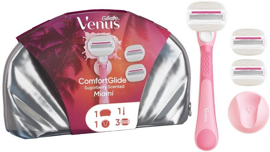 Gillette Venus ComfortGlide Sugarberry Miami zestaw: rączka + 3 wkłady + uchwyt prysznicowy + kosmetyczka ZWYKŁA MASZYNKA DO GOLENIA? Nie narażaj swojej suchej skóry na szwank. Maszynka do golenia Gillette Venus ComfortGlide Miami dla kobiet pozwoli Ci zatroszczyć się o skórę tak, jak na to …