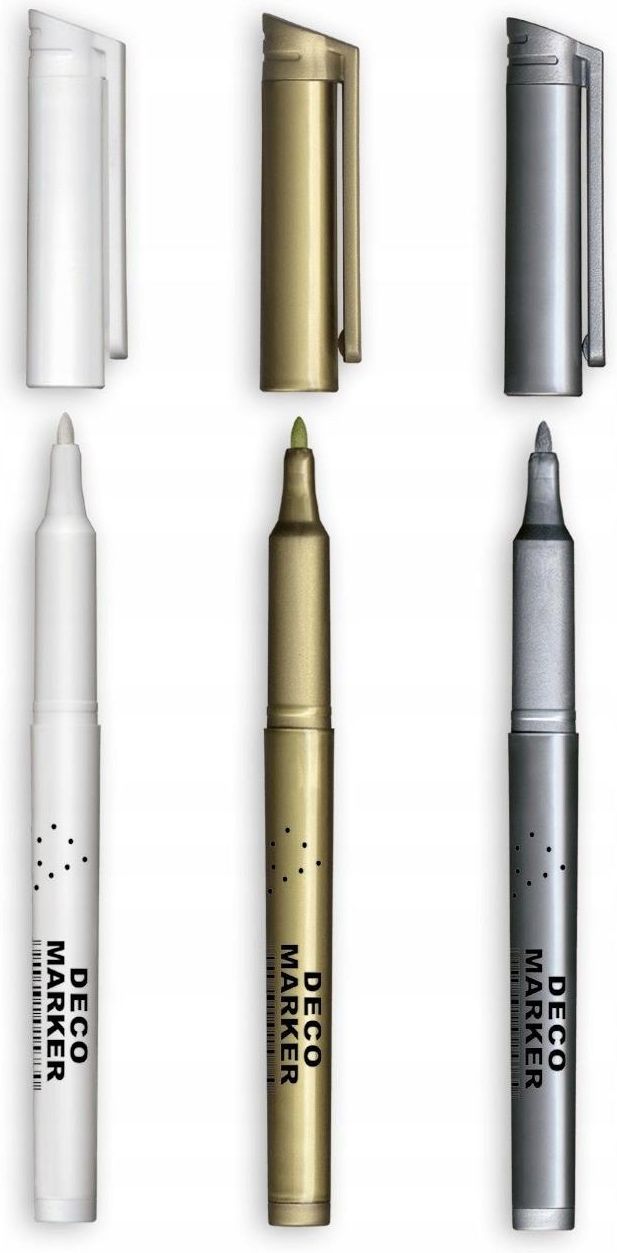 Markery dekoracyjne Granit DECO M850 3 szt.- złoty, srebrny, biały Deco marker wodoodporny Granit M850 to wszechstronne narzędzie idealne do różnorodnych zastosowań artystycznych i dekoracyjnych. Doskonale sprawdza się przy dekoracjach świątecznych, dekupażu oraz pisaniu na powierzchniach takich jak papier, ceramika, szkło, plastik, a także zdjęcia i albumy. Dzięki wodoodpornemu atramentowi na bazie wody, użytkownicy mogą cieszyć się trwałymi i wyrazistymi efektami, które odporne są na ścieranie. Specyfikacja Kolory markerów w zestawie: srebrny, złoty, biały Grubość linii pisania: 1 mm Długość markera: 13 cm (5,1 cala) Zestaw trzech markerów w kolorach srebrnym, złotym i białym pozwala na twórcze eksperymenty i ozdabianie różnorodnych powierzchni. Są one szczególnie przydatne przy pracach na ciemnych materiałach, gdzie kolory te zapewniają doskonałą widoczność i kontrast. Dzięki ergonomicznemu kształtowi i lekkiej konstrukcji, markery te są wygodne w użyciu, co pozwala na precyzyjne pisanie i dekorowanie. Atrament na bazie wody nie tylko zapewnia intensywne kolory, ale także minimalizuje ryzyko smug i zaciekań, co jest kluczowe przy precyzyjnych pracach artystycznych. Markery Granit M850 są wyprodukowane w Polsce, co gwarantuje wysoką jakość wykonania oraz trwałość produktu. Niezależnie od tego, czy jesteś doświadczonym artystą, czy amatorem, te markery z pewnością spełnią Twoje oczekiwania i staną się nieodłącznym elementem Twojego zestawu do tworzenia dekoracji.