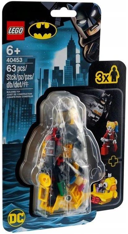 LEGO 40453 DC Batman kontra Pingwin i Harley Quinn . Producent: LEGO Seria: BATMAN Numer katalogowy: 40453 Wiek: 6+ Ilość elementów: 63 Klocki LEGO® 40453 Batman™ kontra Pingwin i Harley Quinn Fani superbohaterów ucieszą się z zestawu, który pozwala odgrywać historie o walce ze złem z udziałem Batmana™ i dwójki superzłoczyńców. Zabawka wciągnie i zachwyci małych budowniczych: Pingwin™ jeździ swoją kaczą łodzią (do zbudowania), Harley Quinn™ walczy wielkim młotem, a sejf bankowy można wysadzić dynamitem i ukraść z niego pieniądze! Zawiera trzy minifigurki — Batmana™, Pingwina™ z parasolem do zbudowania i Harley Quinn™ z młotem do zbudowania. W pudełku jest także zabawkowy kaczy pojazd, pojemniki z sejfu bankowego, pieniądze, dynamit oraz maszyna do wysadzania, którą trzeba złożyć z klocków. Fajna zabawka dla małych superbohaterów w wieku od 6 lat.