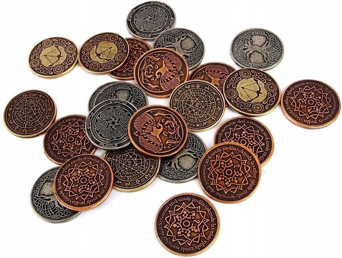 METALOWE MONETY - ELFICKIE (ZESTAW 24 MONET) Waluta dla gier planszowych Wykonany ze stopów cynku komplet 24 monet, zainspirowanych elfickim folklorem. Posiadają nieograniczoną ilość zastosowań - sprawdzają się jako realistyczne żetony w takich grach planszowych, jak Terra Mystica, Władca …