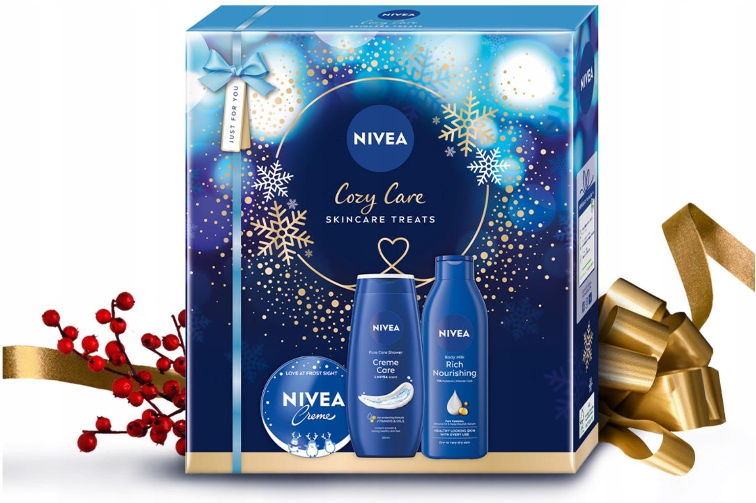 NIVEA Cosy Care Świąteczny Zestaw kosmetyków NIVEA Odżywcze mleczko do ciała, 250ml NIVEA Pielęgnujący żel pod prysznic, 250ml NIVEA Creme Krem uniwersalny 30 mlt Pielęgnuj magię Świąt i spraw radość bliskiej osobie z upominkowym zestawem kosmetyków na prezent! Pokaż, że zasługuje na chwilę tylko …