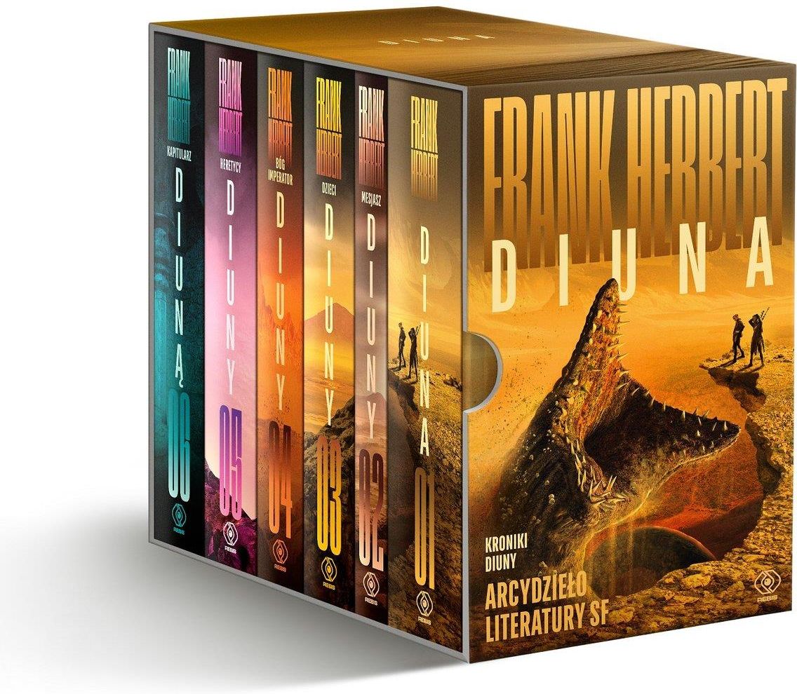 Pakiet obejmuje sześć części poprawionych Kronik Diuny: Diuna, Mesjasz Diuny, Dzieci Diuny, Bóg Imperator Diuny, Heretycy Diuny i Kapitularz Diuną. W pierwszym tomie Kronik poznajemy Arrakis, zwane Diuną, czyli źródło melanżu, który jest substancją umożliwiającą wydłużenie życia. Diuna pozwala bohaterom także na odbywanie podróży kosmicznych i przewidywanie zdarzeń, które wydarzą się w przyszłości. Jak można się domyślać, wszyscy chcą przejąć Diunę. W pierwszej części cyklu dotychczas rządzący źródłem Harkonnenowie opuszczają planetę, a Diunę przejmują jako lenno Atrydzi, z którymi walczyli. Planetą rządzi odtąd książę Leto, ale jego wygrana jest pozorna. Wkrótce na czele mieszkańców Diuny staje Paul, dziedzic rodu Atrydów. Walczy z połączonymi siłami Imperium i Harkonnenów. Czy wygra? Jeśli jesteś fanem literatury science fiction, nie pozostaniesz obojętny wobec serii stworzonej przez Franka Herberta pt. Kroniki Diuny. Spodziewaj się przygody w najlepszym wydaniu, która łączy w sobie elementy polityki, ekologii i mistycyzmu. Czekasz z niecierpliwością na najnowszą ekranizację Diuny? Jeśli chcesz poznać wersję książkową tej historii, sięgnij po pakiet Kroniki Diuny. Niepowtarzalna opowieść Diuna jest opowieścią snutą w sposób bardzo konsekwentny, z niezwykłą fantazją. Jej złożoność dotyczy przede wszystkim wykreowanego świata fantastycznego, przyrównywana jest do dzieł Tolkiena.
