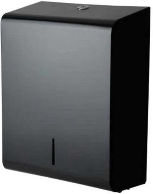 Czarny pojemnik na ręczniki papierowe w listkach materiał: stal nierdzewna kolor: czarny okienko do kontroli ilości papieru pojemność: ok 600-900 listków zamykanie: kluczyk stalowy wymiary: 255x325x115 mm
