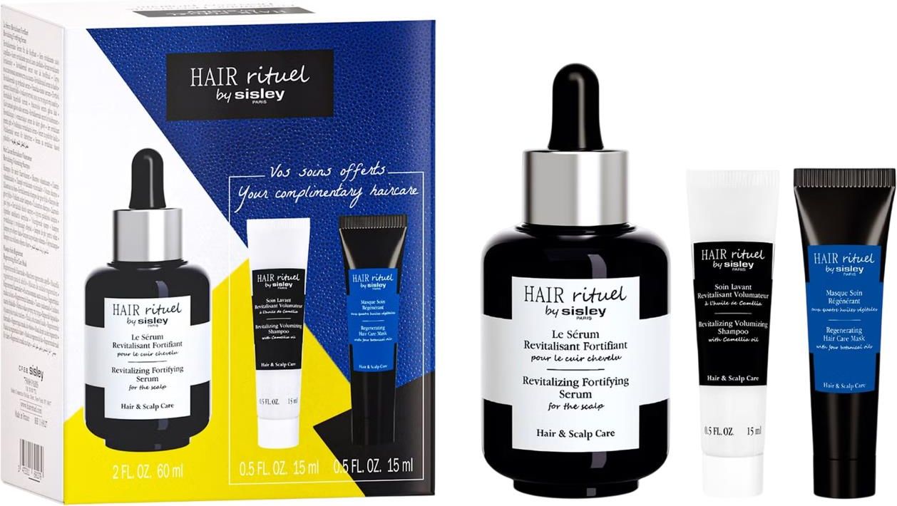 Najwyższej jakości pielęgnacja włosów - siła natury i nauki od Sisley.Zestaw Sisley Hair Rituel to innowacyjny kompleks produktów wzmacniających, odbudowujących i chroniących włosy oraz skórę głowy. Jest idealna dla osób poszukujących skutecznego środka przeciw wypadaniu włosów, zachowania ich gęstości i naturalnego blasku.W skład zestawu wchodzą:Revitalizing Fortifying Serum do skóry głowy, które zmniejsza wypadanie włosów. Włosy stają się mocniejsze i bardziej gęste. Wysoce skoncentrowane ekstrakty pochodzenia roślinnego, proteiny, witaminy i minerały sprawiają, że ta wzmacniająca formuła serum podnosi poziom energii w skórze głowy, wzmacnia włosy i chroni ich naturalny kolor. Świeży zapach dopełnia skuteczność składników aktywnych.Ultra lekką, nietłustą formułę należy wmasować w skórę głowy.Revitalizing Volumizing Shampoo to szampon, który delikatnie myje, dostarczając niezbędnych witamin i minerałów dla witalności skóry głowy i włosów. Jego formuła korzysta z połączenia skutecznych składników aktywnych, które działają na cebulkę włosa. Płynna konsystencja szamponu przy kontakcie z wodą przekształca się w drobną i bogatą pianę.Regenerating Hair Care Mask wzbogacona czterema olejkami roślinnymi. Kompletna odnowa skóry głowy i włosów. Formuła oparta na wysoce skoncetrowanych ekstraktach pochodzenia roślinnego, proteinach, witaminach i minerałach, które energizują skórę głowy oraz wzmacniają zniszczone włosy od cebulek. Olejki Shea, Macadamia, Camellia i z orzechów laskowych odbudowują i intensywnie odżywiają włókna włosów. Świeży zapach dopełnia skuteczność składników aktywnych. Lekka i kremowa konsystencja, którą należy wmasować we włosy i skórę głowy.