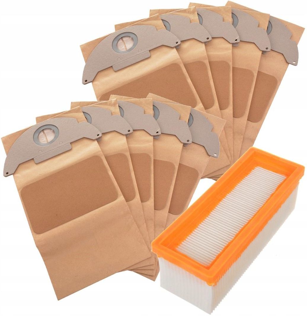 KOMPLET 10SZT WORKÓW PAPIEROWYCH + FILTR POWIETRZA Opis przedmiotu Oferujemy Państwu komplet wysokiej klasy worków z dwuwarstwowego papieru filtracyjnego do odkurzaczy KARCHER. Worki są zamiennikiem oryginalnego towaru firmy Karcher oznaczonego numerem katalogowym: 6.904-143.0. Wysokiej jakości zamiennik filtra powietrza do odkurzaczy Karcher który dzięki zastosowaniu najlepszej jakości materiałów zapewnia wysoki stopień filtracji oraz odporność na uszkodzenia mechaniczne. Filtr jest zamiennikiem produktu Karcher oznaczonego numerem katalogowym: 6.414-498.0 Zalety worków papierowych Większa moc odkurzania Niższe koszty - rzadsza wymiana worków Szczelne wypełnienie komory odkurzacza, co pozwala na pochłonięcie większej ilości kurzu Worki biodegradowalne Odporne na rozdarcia 2-warstwowy materiał filtracyjny Kompatybilność A 2701 A 2731 A 2801 K 2501 K 2601 K 3001 SE 2001 SE 3001 SE 5.100 SE 6.100 NT 181 Dane techniczne WORKÓW Materiał - papier filtracyjny Ilość warstw filtracji - 2 Zastosowanie - odkurzanie na sucho Typ - zamiennik (Karcher 6.904-143.0) Wymiary worka - szer.21cm x dł. 42cm Ilość w paczce - 10 sztuk Opakowanie - foliowe, zgrzewane Stan - nowe Dane techniczne FILTRA Materiał - papier filtracyjny Zastosowanie - odkurzanie na sucho Typ - zamiennik (Karcher 6.414-498.0) Wymiary filtra - 7,5cm x 20cm Ilość - 1szt Stan - nowe