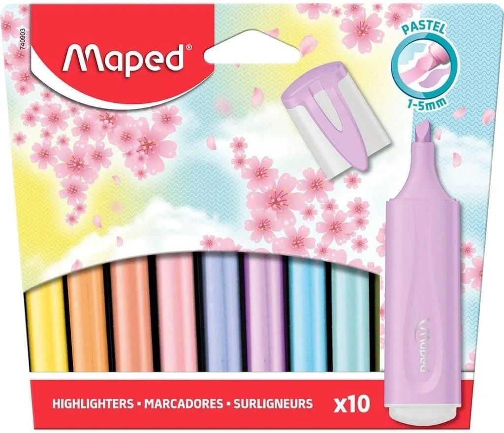 MAPED ID:11174/MP0903 Klasyczne zakreślacze MAPED Classic New pastelowe 10 sztuk klasyczny kształt obudowy tusz nietoksyczny o wysokiej wydajności i trwałości, odporny na działanie światła do wszystkich papierów standardowych, samokopiujących, fotokopii, termopapierów i papierów faksowych pozostawiony bez skuwki nie traci swoich właściwości nawet po 4 godzinach ścięta końcówka umożliwia pisanie cienką i grubą linią, od 1 do 5 mm etui zawiera zakreślacze w 10 pastelowych kolorach w tym 4 w nowych odcieniach