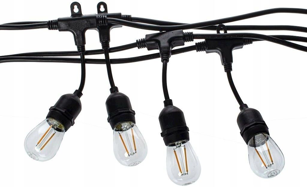Girlanda ogrodowa +żarówkami LED Długość: 60 m Ilość żarówek: 60 szt.(przezroczyste) Gwint: E27 Moc żarówki: LED 1,5W Barwa światła: ciepła biała (2700K) Zasilanie: 230V Możliwość łączenia: TAK IP: IP44 Długość girlandy: 60 m Odstępy pomiędzy gniazdami: 95 cm Zastosowanie: girlandy ogrodowe, pozwalają stworzyć nastrój w ogrodzie, na tarasie, na werandzie, delikatne ciepłe światło sprawia, iż miejsce z pozoru typowe staje się fantastycznym miejscem relaksu i odpoczynku. Technologia LED: girlandy wykonane zostały w taki sposób, iż można z powodzeniem stosować do nich nowoczesne żarówki LED, w zestawie girlanda zawiera 60 szt żarówek LED o barwie ciepłej światła (2700K) Prosty montaż: girlandy przygotowane zostały tak, aby można było je z łatwością zainstalować, gniazda E27 w które wkręcane są żarówki, posiadają uchwyty mocujące, wiązka natomiast zakończona jest gniazdem umożliwiającym podłączenie kolejnego odcinka girlandy. Na zewnątrz oraz do wnętrza: dzięki precyzyjnemu wykonaniu girlandy z powodzeniem nadają się do ich instalacji również na dworze, na zewnątrz.