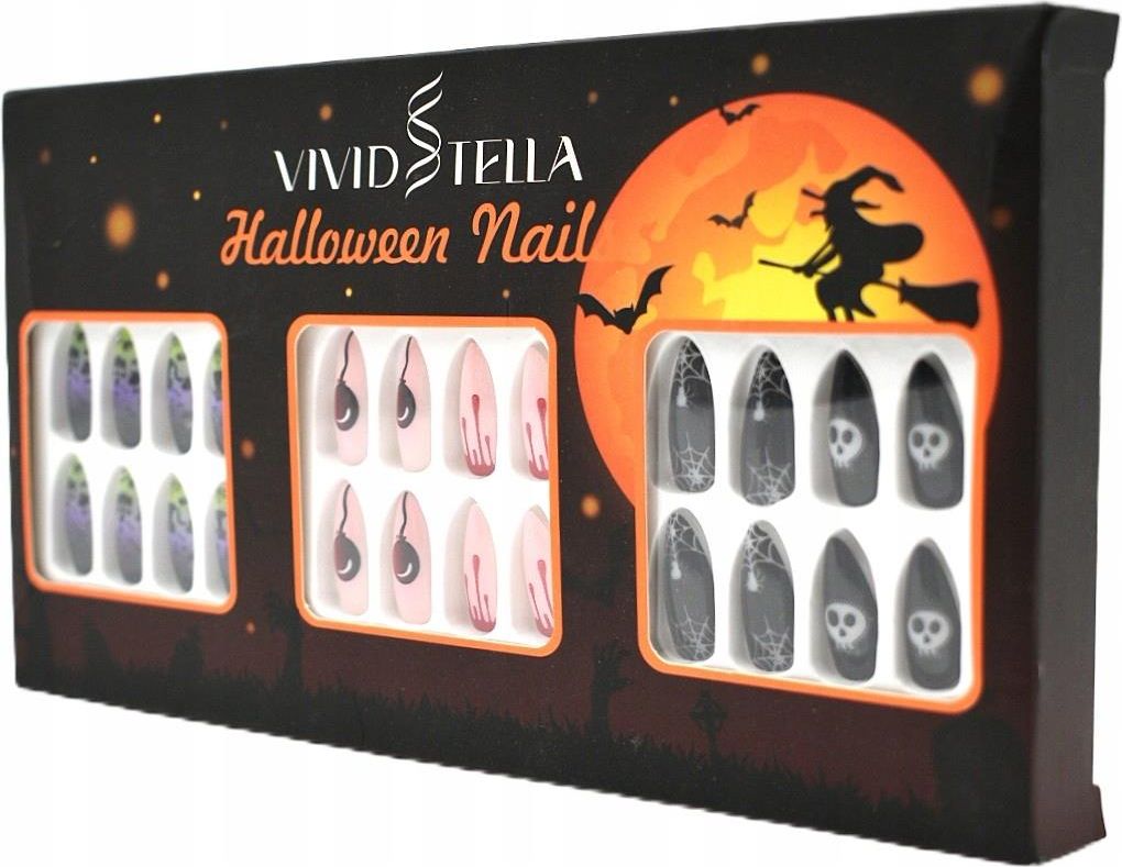 262384325 72 paznokcie samoprzylepne specjalnie na Halloween! Typ migdał. 6 wzorów w 3 wariantach kolorystycznych oraz różnych rozmiarach. W zestawie akcesoria do nakładania i pielęgnacji.