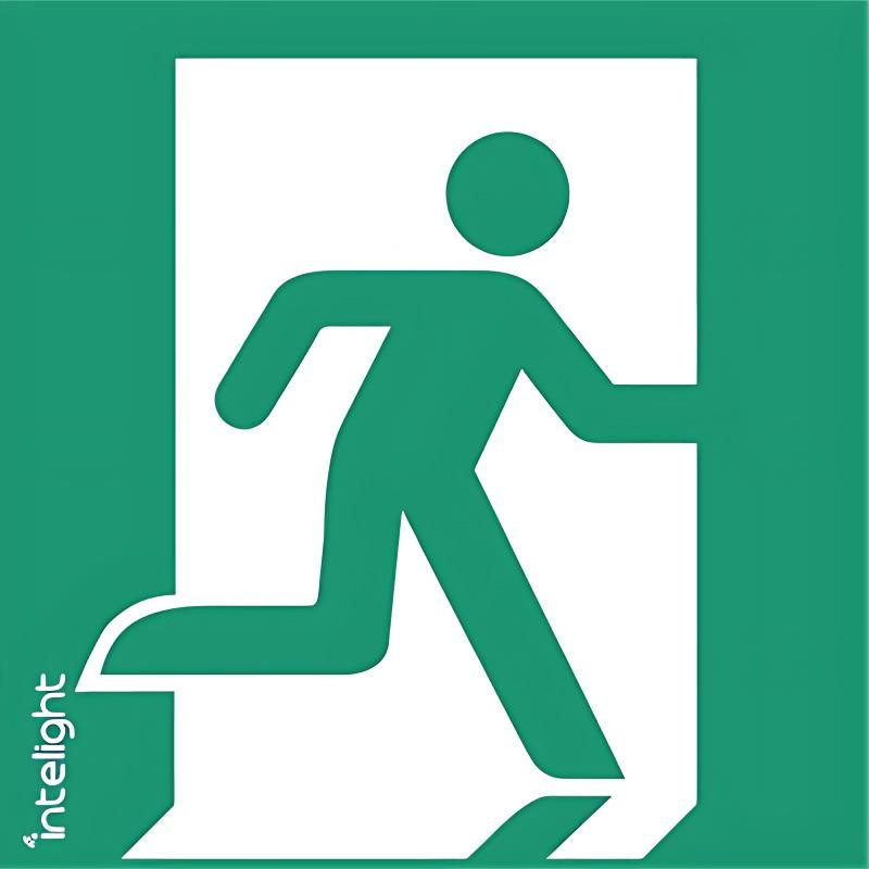 Piktogram o wymiarach 125 x 125 mm przeznaczony do opraw z serii Directo S, Vella firmy Intelight. Po naklejeniu na klosz oprawy będzie ona pełniła funkcję wskazywania kierunku ewakuacji. Piktogram w ciemnoozielonym kolorze z logiem producenta.