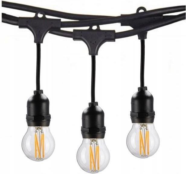 Girlanda Ogrodowa łańcuch 60m +żarówki LED 4W E27 Girlanda Ogrodowa + Żarówki LED Długość: 60 m Ilość żarówek: 60 szt.(szkło przezroczyste) Gwint: E27 Moc żarówki: LED 5W Barwa światła: ciepła Zasilanie: 230V Możliwość łączenia: TAK IP: IP44 Długość girlandy: 60 m Odstępy pomiędzy gniazdami: 95 cm Zastosowanie: girlandy ogrodowe, pozwalają stworzyć nastrój w ogrodzie, na tarasie, na werandzie, delikatne ciepłe światło sprawia, iż miejsce z pozoru typowe staje się fantastycznym miejscem relaksu i odpoczynku. Technologia LED: girlandy wykonane zostały w taki sposób, iż można z powodzeniem stosować do nich nowoczesne żarówki LED, w zestawie girlanda zawiera 60 szt żarówek LED o barwie ciepłej światła. Prosty montaż: girlandy przygotowane zostały tak, aby można było je z łatwością zainstalować, gniazda E27 w które wkręcane są żarówki, posiadają uchwyty mocujące, wiązka natomiast zakończona jest gniazdem umożliwiającym podłączenie kolejnego odcinka girlandy. Na zewnątrz oraz do wnętrza: dzięki precyzyjnemu wykonaniu girlandy z powodzeniem nadają się do ich instalacji również na dworze, na zewnątrz.