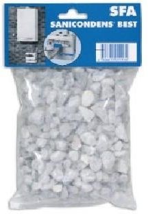 Neutralizator kondensatu - SANIGRANUL Produkcji polskiej firmy SFA Index: Sanigranul Zastosowanie SANIGRANUL jest neutralizatorem kondensatu w postaci granulek przeznaczonym do urządzenia SANINEUTRAL neutralizującego kondensat firmy SFA oraz do innych podobnych urządzeń. Stosowany jako wkład w tych urządzeniach, aby zobojętnić odczyn skroplin - głównie z kotłów kondensacyjnych. Skład Hydrolizat magnezu w postaci granulatu. Opakowanie Woreczek z zawartością około 1,2 kg granulek. W trakcie transportu kuleczki trą o siebie i powstaje trochę pyłu/miału - całość oczywiście zachowuje właściwości chemiczne i nadal jest neutralizatorem. Postepowanie Wymiany na nowy produkt należy dokonać, gdy granulki robią się transparentne. Zużyte granulki należy oddać w Ekoporcie tam gdzie zużyte baterie i akumulatory. Złoże o masie 1 kg wystarcza na około 1 rok. Czas ten jest uzależniony od mocy kotła i ilości kondensatu.