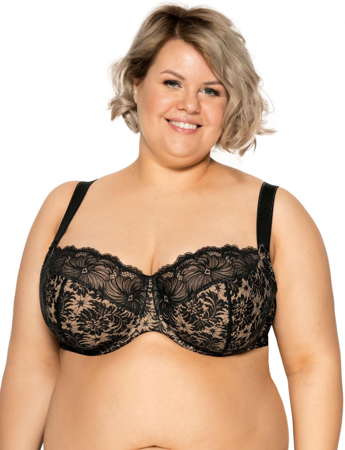 Biustonosz CHENTAI MAXI to elegancka propozycja dla Pań obdarzonych pełniejszymi kształtami (rozmiary do K!). Miękki biustonosz wykonany z czarnej ażurowej koronki o kwiatowym wzorze w połączeniu z kolorem beżowym.. Wewnętrzna strona miseczek podszyta jest delikatną 100% bawełną. Konstrukcja ładnie …