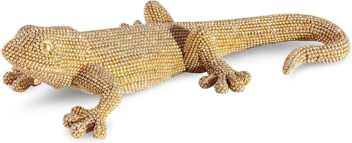 Figurka dekoracyjna ELDO 25X12X6 Eurofirany złota jaszczurka Eurofirany Figurka dekoracyjna ELDO w postaci jaszczurki, wykonana z żywicy poliestrowej, prezentuje się elegancko i efektownie. Jej złoty kolor i strukturalna powierzchnia przyciągają wzrok i dodają egzotycznego uroku, co sprawia, że idealnie komponuje się z różnymi stylami wnętrzarskimi. Jaszczurka jest symbolem zwinności i zdolności regeneracji. Ta złota figurka nadaje pomieszczeniu wyrafinowanego charakteru i prestiżu. Jest doskonałym elementem ozdobnym do salonu, gabinetu czy sypialni, nadając wnętrzu ekskluzywnego wyglądu. Wykonana z żywicy poliestrowej, figurka jest trwała i odporna na uszkodzenia, co gwarantuje długotrwałą przyjemność z jej użytkowania. Dzięki jej unikatowemu designowi oraz wysokiej jakości wykonania, ta figurka dekoracyjna stanie się nie tylko eleganckim dodatkiem do wnętrza, ale również wyrazem indywidualnego stylu i gustu właściciela. Szerokość: 12 cm, długość: 25 cm, wysokość: 6 cm Kolor: złoty Skład: żywica poliestrowa Kolor: złoty Skład: żywica poliestrowa Rozmiar: 25x12x6
