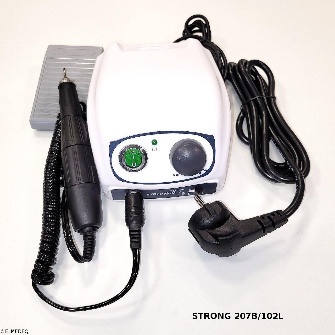 Frezarka STRONG 207B/102L Frezarka Strong 207B/102L jest bardziej estetycznym odpowiednikiem znanej wersji STRONG 90N/102L, przeznaczona dla techników dentystycznych, pracowni protetycznych oraz do gabinetów kosmetycznych. Kompaktowa, niedroga i tania w eksploatacji frezarka sprawdza się idealnie w pracowniach, w których istotna jest wysoka jakość oraz korzystna cena. Można z niej również korzystać bezpośrednio w gabinecie stomatologicznym w celu dokonywania drobnych poprawek oraz w salonach kosmetycznych do opracowywania paznokci. Frezarka posiada rączkę typu TWIST-LOCK. Ze względu na małe rozmiary i masę sprawdza się idealnie w gabinetach kosmetycznych. Wersja zasilacza STRONG 207B posiada możliwość uruchamiania silnika za pomocą sterownika nożnego lub obsługi całkowicie ręcznej. Regulacja obrotów odbywa się zawsze za pomocą pokrętła na obudowie zasilacza. Cechy Produktu 💡 Estetyczny design: Nowoczesny wygląd, który poprawia estetykę każdego gabinetu. ⚙️ Rączka TWIST-LOCK: Ułatwia szybkie i bezpieczne wymiany narzędzi. 🔄 Regulacja obrotów: Precyzyjne dostosowanie prędkości za pomocą pokrętła. 👣 Sterownik nożny: Możliwość uruchamiania silnika za pomocą pedału nożnego. 🏋️‍♂️ Lekka konstrukcja: Idealna do przenoszenia i użytkowania w różnych miejscach. Zastosowanie produktu Frezarka STRONG 207B/102L jest przeznaczona dla techników dentystycznych, pracowni protetycznych oraz do gabinetów kosmetycznych. Może być używana do dokonywania drobnych poprawek w gabinetach stomatologicznych oraz do opracowywania paznokci w salonach kosmetycznych. Najważniejsze składniki Zasilacz STRONG 207B: Z możliwością uruchamiania silnika za pomocą sterownika nożnego lub ręcznego. Rączka TWIST-LOCK: Umożliwia szybkie i bezpieczne wymiany narzędzi. Sterownik nożny: Umożliwia wygodne uruchamianie silnika. Stosowanie Regulacja obrotów: Prędkość obrotów można łatwo dostosować za pomocą pokrętła na obudowie zasilacza. Wymiana narzędzi: Dzięki rączce TWIST-LOCK wymiana narzędzi jest szybka i bezpieczna. Uruchamianie: Możliwość uruchamiania silnika za pomocą sterownika nożnego lub ręcznie. Zestaw zawiera Stacja zasilająca z kablem sieciowym Frezarka Podstawa frezarki Zapasowe szczotki do silnika Sterownik nożny Gwarancja 2 lata Instrukcja w języku polskim Specyfikacja techniczna Parametry zasilacza jednostki sterującej 207 Wartości Zasilanie AC 240V 50/60 Hz Maksymalny prąd obciążenia 3A Napięcie wyjściowe DC 0-32V Bezpiecznik 220V / 2A Masa 1,2kg Wymiary 130x150x84 Parametry rączki Wartości Prędkość obrotowa 35,000 Masa 196g Moment obrotowy 2.8Ncm Moc 65W